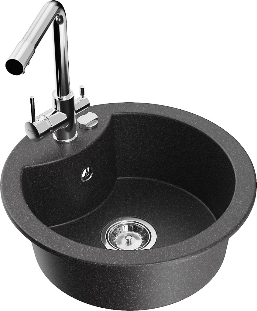 Technické dáta: drez: Rozmery: 488 x 488 x 167 mm Hĺbka komory: 157 mm Šírka komory: 406 mm Priemer odtoku: ø90 mm Typ: 1-komorový Typ: Zapustené do pracovnej dosky Farba: Škvrnitá čierna Povrchová úprava sifónu: Chrome Materiál: žula (80% žulové kamenivo, 20% živice) Prepadový otvor: Áno Otvory: (batérie, automatické) 2 Vysoká odolnosť proti poškriabaniu a zmene farby Odolnosť proti tepelným šokom Ľahko čistiteľný povrch Jeden dodatočný vyfrézovaný otvor na samodierovanie ø35 kuchynská batéria: Materiál: mosadz Farba: Chrome Hlava: Keramická Prevzdušňovač: Áno Typ: Dve rukoväte Rozsah výtoku: 235 mm Výška batérie: 315 mm Dvojhlavá batéria s prídavným kanálom pre filtrovanú pitnú vodu(GT) Ean: 5905315025111