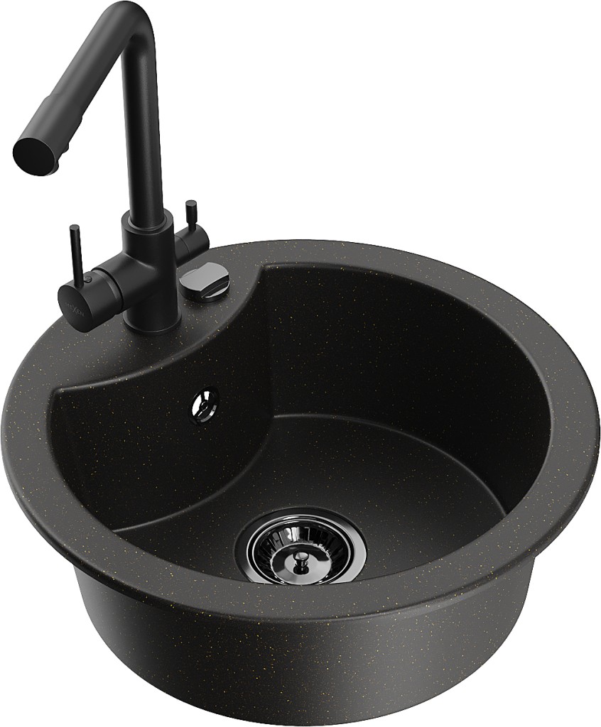 Technické dáta: drez: Rozmery: 488 x 488 x 167 mm Hĺbka komory: 157 mm Šírka komory: 406 mm Priemer odtoku: ø90 mm Typ: 1-komorový Typ: Zapustené do pracovnej dosky Farba: čierna / zlatá metalíza Povrchová úprava sifónu: čierna Materiál: žula (80% žulové kamenivo, 20% živice) Prepadový otvor: Áno Otvory: (batérie, automatické) 2 Vysoká odolnosť proti poškriabaniu a zmene farby Odolnosť proti tepelným šokom Ľahko čistiteľný povrch Jeden dodatočný vyfrézovaný otvor na samodierovanie ø35 kuchynská batéria: Materiál: mosadz Čierna farba Hlava: Keramická Prevzdušňovač: Áno Typ: Dve rukoväte Rozsah výtoku: 235 mm Výška batérie: 315 mm Dvojhlavá batéria s prídavným kanálom pre filtrovanú pitnú vodu(GT) Ean: 5905315025098