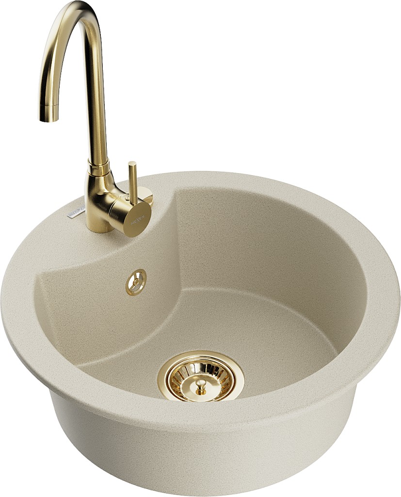 Technické dáta: Drez: Rozmer: 488x488x167 mm Hĺbka komory: 157 mm Šírka komory: 406 mm Priemer odtoku: ø90 mm Typ: 1-komorový Typ: Zapustené do pracovnej dosky Farba béžová Povrchová úprava sifónu: zlatá Materiál: žula (80% žulové kamenivo 20% živice) Prepadový otvor: Áno Otvory: (batérie, automat) 2 Vysoká odolnosť proti poškriabaniu a zmene farby Odolnosť proti tepelným šokom Povrch pre ľahké čistenie Jeden dodatočný vyfrézovaný otvor na samodierovanie ø35 Kuchynská batéria: Materiál: mosadz Farba: Zlatá Hlava: Keramická Perlátor: Áno Typ: Jednopáková Výška batérie: 335 mm Rozsah výtoku: 180 mm(GT) Ean: 5905315015273