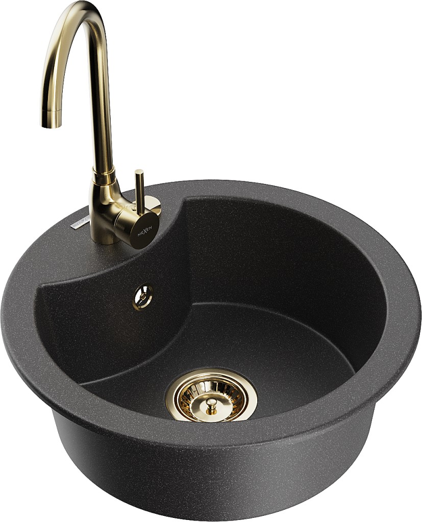 Technické dáta: drez: Rozmery: 488 x 488 x 167 mm Hĺbka komory: 157 mm Šírka komory: 406 mm Priemer odtoku: ø90 mm Typ: 1-komorový Typ: Zapustené do pracovnej dosky Farba: Škvrnitá čierna Povrchová úprava sifónu: zlatá Materiál: žula (80% žulové kamenivo, 20% živice) Prepadový otvor: Áno Otvory: (batérie, automatické) 2 Vysoká odolnosť proti poškriabaniu a zmene farby Odolnosť proti tepelným šokom Ľahko čistiteľný povrch Jeden dodatočný vyfrézovaný otvor na samodierovanie ø35 kuchynská batéria: Materiál: mosadz Farba: Zlatá Hlava: Keramická Prevzdušňovač: Áno Typ: Jedna páka Výška batérie: 335 mm Rozsah výtoku: 180 mm(GT) Ean: 5905315015372