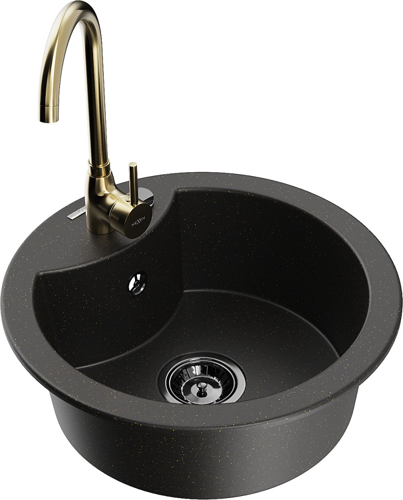Technické dáta: drez: Rozmery: 488 x 488 x 167 mm Hĺbka komory: 157 mm Šírka komory: 406 mm Priemer odtoku: ø90 mm Typ: 1-komorový Typ: Zapustené do pracovnej dosky Farba: čierna / zlatá metalíza Povrchová úprava sifónu: čierna Materiál: žula (80% žulové kamenivo, 20% živice) Prepadový otvor: Áno Otvory: (batérie, automatické) 2 Vysoká odolnosť proti poškriabaniu a zmene farby Odolnosť proti tepelným šokom Ľahko čistiteľný povrch Jeden dodatočný vyfrézovaný otvor na samodierovanie ø35 kuchynská batéria: Materiál: mosadz Farba: Zlatá Hlava: Keramická Prevzdušňovač: Áno Typ: Jedna páka Výška batérie: 335 mm Rozsah výtoku: 180 mm(GT) Ean: 5905315015358