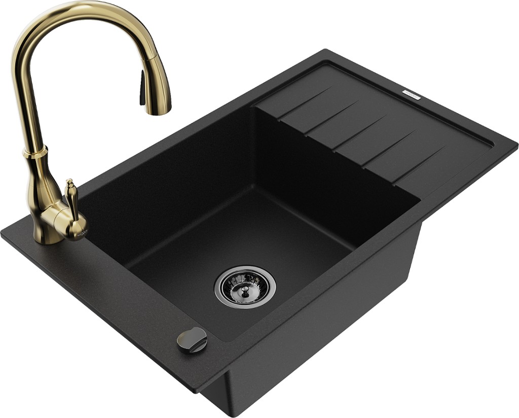 Technické dáta: drez: Rozmer: 795 x 480 x 200 mm Hĺbka komory: 190 mm Rozmery komory: 465x420 mm Priemer odtoku: ø90 mm Typ: 1-miska s krátkym odkvapkávačom Typ: Zapustené do pracovnej dosky Čierna farba Povrchová úprava sifónu: čierna Materiál: žula (80% žulové kamenivo, 20% živice) Prepadový otvor: Áno Otvory: (batérie, automatické) 2 Inštalácia: Univerzálna, je možné inštalovať s odkvapkávačom na ľavú alebo pravú stranu Vysoká odolnosť proti poškriabaniu a zmene farby Odolnosť proti tepelným šokom Ľahko čistiteľný povrch Jeden dodatočný vyfrézovaný otvor na samodierovanie ø35 kuchynská batéria: Materiál: mosadz Farba: Zlatá Hlava: Keramická Prevzdušňovač: Áno Typ: Jedna páka Výška batérie: 410 mm Rozsah výtoku: 231 mm(GT) Ean: 5905315035097