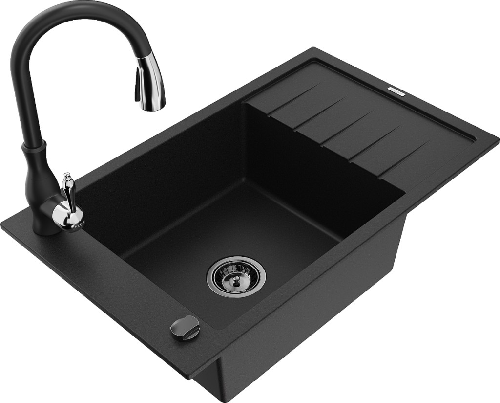 Technické dáta: drez: Rozmer: 795 x 480 x 200 mm Hĺbka komory: 190 mm Rozmery komory: 465x420 mm Priemer odtoku: ø90 mm Typ: 1-miska s krátkym odkvapkávačom Typ: Zapustené do pracovnej dosky Čierna farba Povrchová úprava sifónu: čierna Materiál: žula (80% žulové kamenivo, 20% živice) Prepadový otvor: Áno Otvory: (batérie, automatické) 2 Inštalácia: Univerzálna, je možné inštalovať s odkvapkávačom na ľavú alebo pravú stranu Vysoká odolnosť proti poškriabaniu a zmene farby Odolnosť proti tepelným šokom Ľahko čistiteľný povrch Jeden dodatočný vyfrézovaný otvor na samodierovanie ø35 kuchynská batéria: Materiál: mosadz Čierna farba Hlava: Keramická Prevzdušňovač: Áno Typ: Jedna páka Výška batérie: 410 mm Rozsah výtoku: 231 mm (GT) Ean: 5905315035103