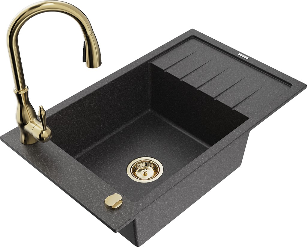 Technické dáta: drez: Rozmer: 795 x 480 x 200 mm Hĺbka komory: 190 mm Rozmery komory: 465x420 mm Priemer odtoku: ø90 mm Typ: 1-miska s krátkym odkvapkávačom Typ: Zapustené do pracovnej dosky Farba: Škvrnitá čierna Povrchová úprava sifónu: zlatá Materiál: žula (80% žulové kamenivo, 20% živice) Prepadový otvor: Áno Otvory: (batérie, automatické) 2 Inštalácia: Univerzálna, je možné inštalovať s odkvapkávačom na ľavú alebo pravú stranu Vysoká odolnosť proti poškriabaniu a zmene farby Odolnosť proti tepelným šokom Ľahko čistiteľný povrch Jeden dodatočný vyfrézovaný otvor na samodierovanie ø35 kuchynská batéria: Materiál: mosadz Farba: Zlatá Hlava: Keramická Prevzdušňovač: Áno Typ: Jedna páka Výška batérie: 410 mm Rozsah výtoku: 231 mm(GT) Ean: 5905315035035