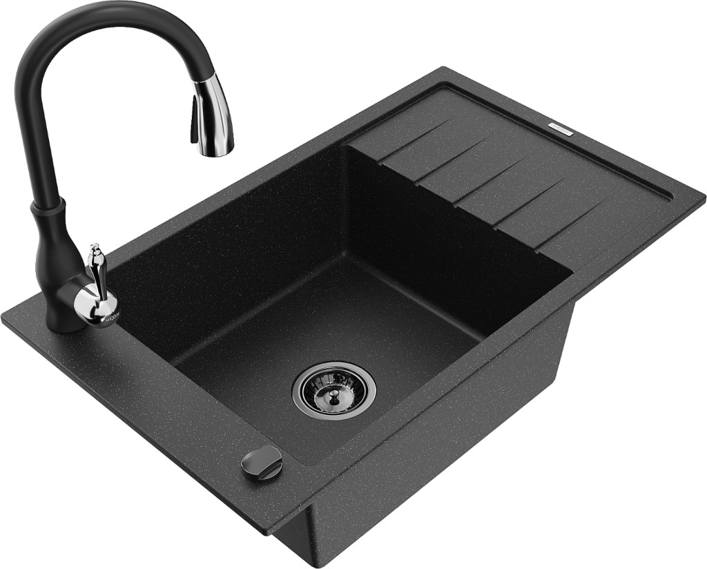 Technické dáta: drez: Rozmer: 795 x 480 x 200 mm Hĺbka komory: 190 mm Rozmery komory: 465x420 mm Priemer odtoku: ø90 mm Typ: 1-miska s krátkym odkvapkávačom Typ: Zapustené do pracovnej dosky Farba: čierna/strieborná metalíza Povrchová úprava sifónu: čierna Materiál: žula (80% žulové kamenivo, 20% živice) Prepadový otvor: Áno Otvory: (batérie, automatické) 2 Inštalácia: Univerzálna, je možné inštalovať s odkvapkávačom na ľavú alebo pravú stranu Vysoká odolnosť proti poškriabaniu a zmene farby Odolnosť proti tepelným šokom Ľahko čistiteľný povrch Jeden dodatočný vyfrézovaný otvor na samodierovanie ø35 kuchynská batéria: Materiál: mosadz Čierna farba Hlava: Keramická Prevzdušňovač: Áno Typ: Jedna páka Výška batérie: 410 mm Rozsah výtoku: 231 mm(GT) Ean: 5905315034953