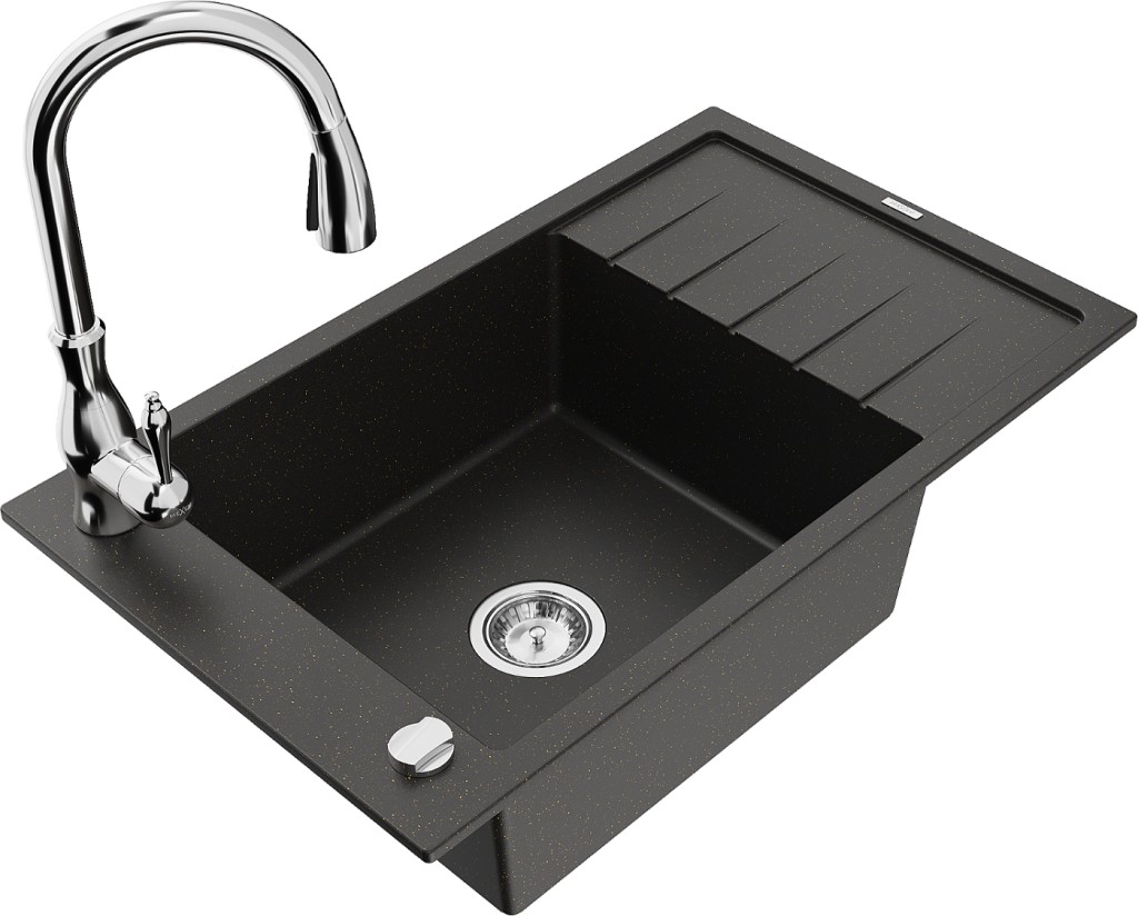 Technické dáta: drez: Rozmer: 795 x 480 x 200 mm Hĺbka komory: 190 mm Rozmery komory: 465x420 mm Priemer odtoku: ø90 mm Typ: 1-miska s krátkym odkvapkávačom Typ: Zapustené do pracovnej dosky Farba: čierna / zlatá metalíza Povrchová úprava sifónu: Chrome Materiál: žula (80% žulové kamenivo, 20% živice) Prepadový otvor: Áno Otvory: (batérie, automatické) 2 Inštalácia: Univerzálna, je možné inštalovať s odkvapkávačom na ľavú alebo pravú stranu Vysoká odolnosť proti poškriabaniu a zmene farby Odolnosť proti tepelným šokom Ľahko čistiteľný povrch Jeden dodatočný vyfrézovaný otvor na samodierovanie ø35 kuchynská batéria: Materiál: mosadz Farba: Chrome Hlava: Keramická Prevzdušňovač: Áno Typ: Jedna páka Výška batérie: 410 mm Rozsah výtoku: 231 mm(GT) Ean: 5905315034977