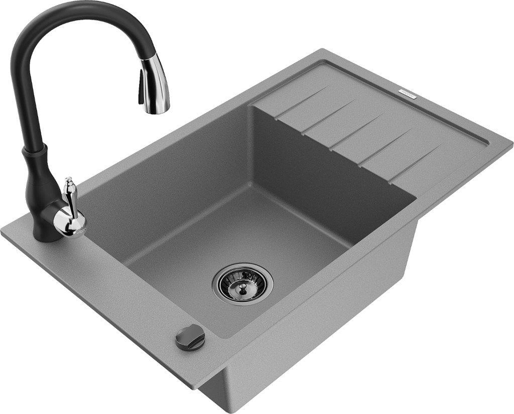 Technické dáta: drez: Rozmer: 795 x 480 x 200 mm Hĺbka komory: 190 mm Rozmery komory: 465x420 mm Priemer odtoku: ø90 mm Typ: 1-miska s krátkym odkvapkávačom Typ: Zapustené do pracovnej dosky Šedá farba Povrchová úprava sifónu: čierna Materiál: žula (80% žulové kamenivo, 20% živice) Prepadový otvor: Áno Otvory: (batérie, automatické) 2 Inštalácia: Univerzálna, je možné inštalovať s odkvapkávačom na ľavú alebo pravú stranu Vysoká odolnosť proti poškriabaniu a zmene farby Odolnosť proti tepelným šokom Ľahko čistiteľný povrch Jeden dodatočný vyfrézovaný otvor na samodierovanie ø35 kuchynská batéria: Materiál: mosadz Čierna farba Hlava: Keramická Prevzdušňovač: Áno Typ: Jedna páka Výška batérie: 410 mm Rozsah výtoku: 231 mm(GT) Ean: 5905315034915