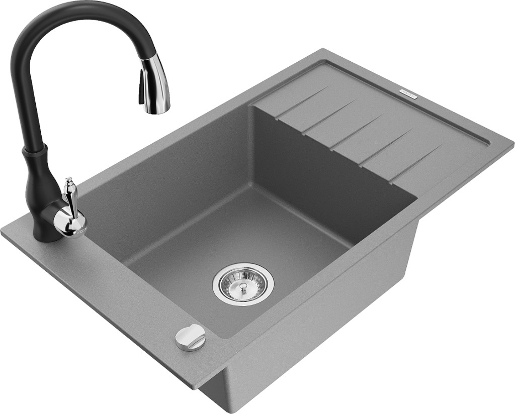 Technické dáta: drez: Rozmer: 795 x 480 x 200 mm Hĺbka komory: 190 mm Rozmery komory: 465x420 mm Priemer odtoku: ø90 mm Typ: 1-miska s krátkym odkvapkávačom Typ: Zapustené do pracovnej dosky Šedá farba Povrchová úprava sifónu: zlatá Materiál: žula (80% žulové kamenivo, 20% živice) Prepadový otvor: Áno Otvory: (batérie, automatické) 2 Inštalácia: Univerzálna, je možné inštalovať s odkvapkávačom na ľavú alebo pravú stranu Vysoká odolnosť proti poškriabaniu a zmene farby Odolnosť proti tepelným šokom Ľahko čistiteľný povrch Jeden dodatočný vyfrézovaný otvor na samodierovanie ø35 kuchynská batéria: Materiál: mosadz Farba: Zlatá Hlava: Keramická Prevzdušňovač: Áno Typ: Jedna páka Výška batérie: 410 mm Rozsah výtoku: 231 mm(GT) Ean: 5905315034908