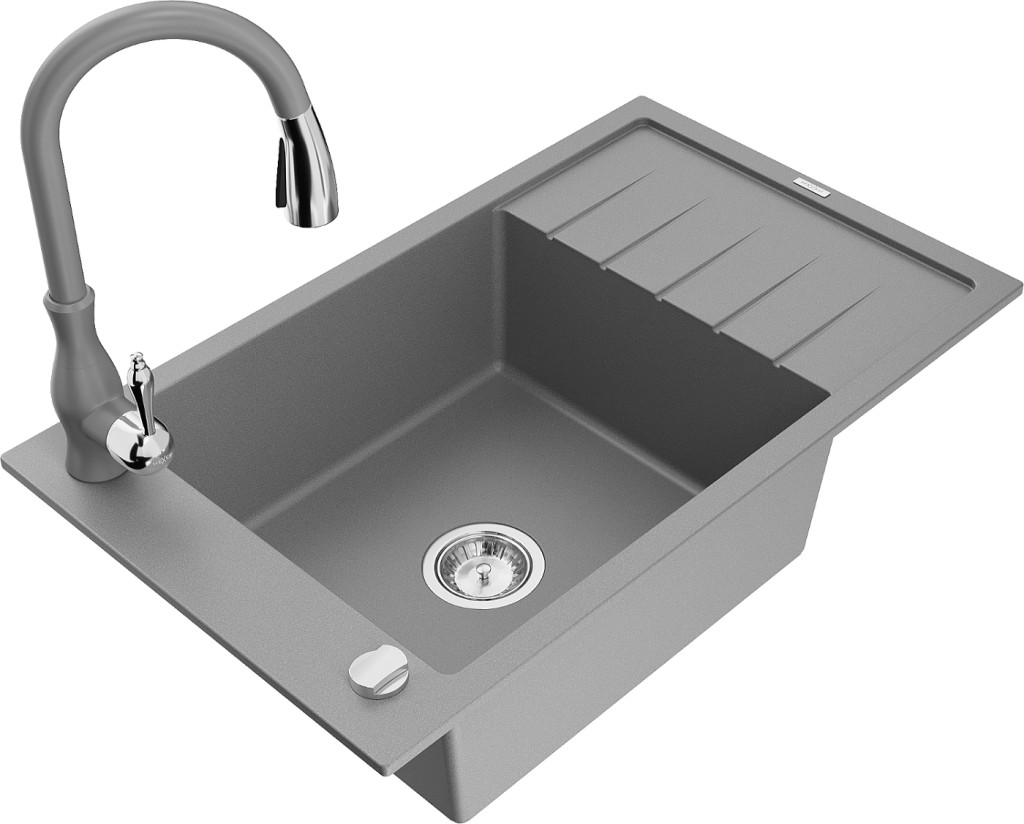 Technické dáta: drez: Rozmer: 795 x 480 x 200 mm Hĺbka komory: 190 mm Rozmery komory: 465x420 mm Priemer odtoku: ø90 mm Typ: 1-miska s krátkym odkvapkávačom Typ: Zapustené do pracovnej dosky Šedá farba Povrchová úprava sifónu: Chrome Materiál: žula (80% žulové kamenivo, 20% živice) Prepadový otvor: Áno Otvory: (batérie, automatické) 2 Inštalácia: Univerzálna, je možné inštalovať s odkvapkávačom na ľavú alebo pravú stranu Vysoká odolnosť proti poškriabaniu a zmene farby Odolnosť proti tepelným šokom Ľahko čistiteľný povrch Jeden dodatočný vyfrézovaný otvor na samodierovanie ø35 kuchynská batéria: Materiál: mosadz Šedá farba Hlava: Keramická Prevzdušňovač: Áno Typ: Jedna páka Výška batérie: 410 mm Rozsah výtoku: 231 mm(GT) Ean: 5905315034922