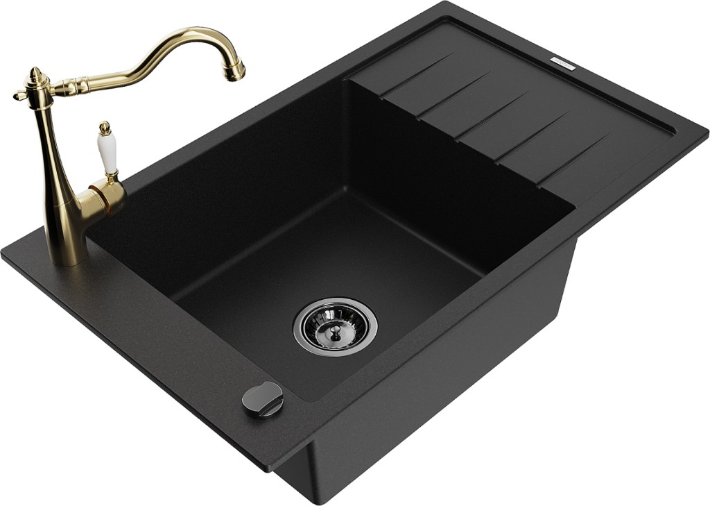 Technické dáta: drez: Rozmer: 795 x 480 x 200 mm Hĺbka komory: 190 mm Rozmery komory: 465x420 mm Priemer odtoku: ø90 mm Typ: 1-miska s krátkym odkvapkávačom Typ: Zapustené do pracovnej dosky Čierna farba Povrchová úprava sifónu: čierna Materiál: žula (80% žulové kamenivo, 20% živice) Prepadový otvor: Áno Otvory: (batérie, automatické) 2 Inštalácia: Univerzálna, je možné inštalovať s odkvapkávačom na ľavú alebo pravú stranu Vysoká odolnosť proti poškriabaniu a zmene farby Odolnosť proti tepelným šokom Ľahko čistiteľný povrch Jeden dodatočný vyfrézovaný otvor na samodierovanie ø35 kuchynská batéria: Materiál: mosadz Farba: Zlatá Hlava: Keramická Prevzdušňovač: Áno Typ: Jedna páka Výška batérie: 290 mm Rozsah výtoku: 260 mm(GT) Ean: 5905315040237