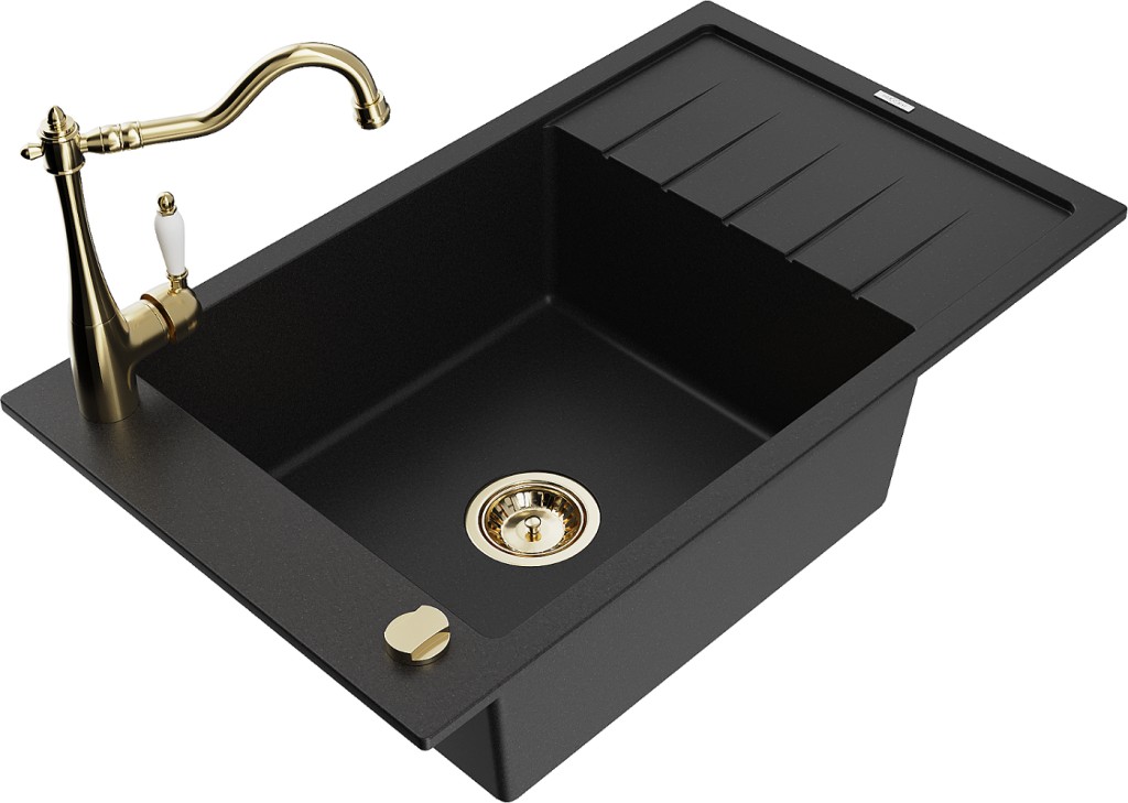 Technické dáta: drez: Rozmer: 795 x 480 x 200 mm Hĺbka komory: 190 mm Rozmery komory: 465x420 mm Priemer odtoku: ø90 mm Typ: 1-miska s krátkym odkvapkávačom Typ: Zapustené do pracovnej dosky Čierna farba Povrchová úprava sifónu: zlatá Materiál: žula (80% žulové kamenivo, 20% živice) Prepadový otvor: Áno Otvory: (batérie, automatické) 2 Inštalácia: Univerzálna, je možné inštalovať s odkvapkávačom na ľavú alebo pravú stranu Vysoká odolnosť proti poškriabaniu a zmene farby Odolnosť proti tepelným šokom Ľahko čistiteľný povrch Jeden dodatočný vyfrézovaný otvor na samodierovanie ø35 kuchynská batéria: Materiál: mosadz Farba: Zlatá Hlava: Keramická Prevzdušňovač: Áno Typ: Jedna páka Výška batérie: 290 mm Rozsah výtoku: 260 mm(GT) Ean: 5905315040220