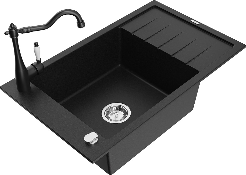Technické dáta: drez: Rozmer: 795 x 480 x 200 mm Hĺbka komory: 190 mm Rozmery komory: 465x420 mm Priemer odtoku: ø90 mm Typ: 1-miska s krátkym odkvapkávačom Typ: Zapustené do pracovnej dosky Čierna farba Povrchová úprava sifónu: Chrome Materiál: žula (80% žulové kamenivo, 20% živice) Prepadový otvor: Áno Otvory: (batérie, automatické) 2 Inštalácia: Univerzálna, je možné inštalovať s odkvapkávačom na ľavú alebo pravú stranu Vysoká odolnosť proti poškriabaniu a zmene farby Odolnosť proti tepelným šokom Ľahko čistiteľný povrch Jeden dodatočný vyfrézovaný otvor na samodierovanie ø35 kuchynská batéria: Materiál: mosadz Čierna farba Hlava: Keramická Prevzdušňovač: Áno Typ: Jedna páka Výška batérie: 290 mm Rozsah výtoku: 260 mm(GT) Ean: 5905315040251