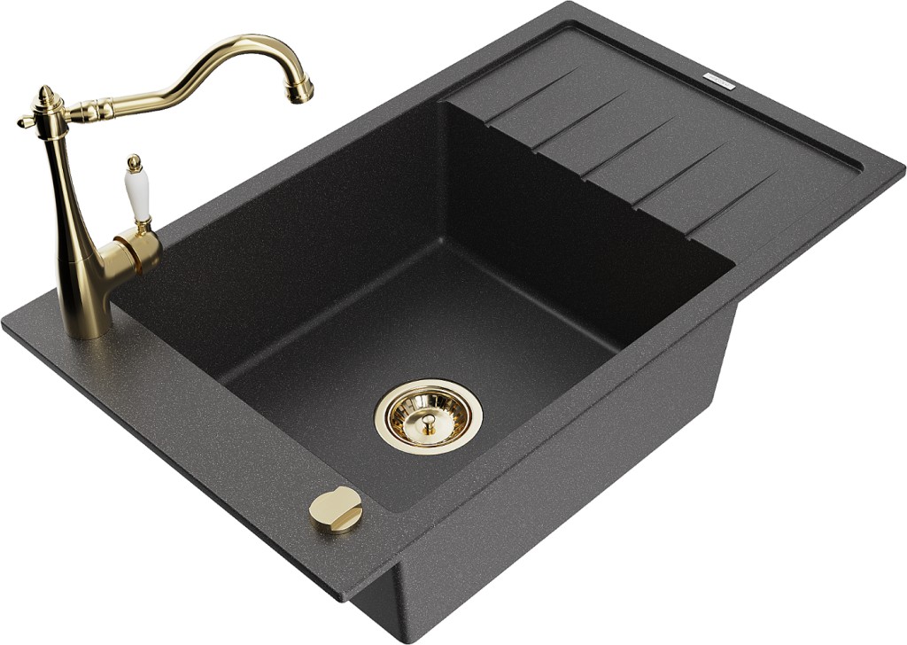 Technické dáta: drez: Rozmer: 795 x 480 x 200 mm Hĺbka komory: 190 mm Rozmery komory: 465x420 mm Priemer odtoku: ø90 mm Typ: 1-miska s krátkym odkvapkávačom Typ: Zapustené do pracovnej dosky Farba: Škvrnitá čierna Povrchová úprava sifónu: zlatá Materiál: žula (80% žulové kamenivo, 20% živice) Prepadový otvor: Áno Otvory: (batérie, automatické) 2 Inštalácia: Univerzálna, je možné inštalovať s odkvapkávačom na ľavú alebo pravú stranu Vysoká odolnosť proti poškriabaniu a zmene farby Odolnosť proti tepelným šokom Ľahko čistiteľný povrch Jeden dodatočný vyfrézovaný otvor na samodierovanie ø35 kuchynská batéria: Materiál: mosadz Farba: Zlatá Hlava: Keramická Prevzdušňovač: Áno Typ: Jedna páka Výška batérie: 290 mm Rozsah výtoku: 260 mm(GT) Ean: 5905315040176