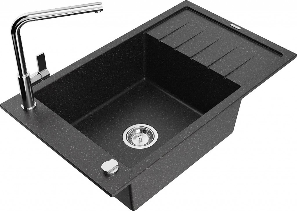 Technické údaje: Kuchyňský dřez: Rozměr: 795x480x200 mm Hloubka komory: 190 mm Rozměry komory: 465x420 mm Průměr odtoku: ø90 mm Typ: 1-miska s krátkým odkapávačem Typ: Zapuštěné do pracovní desky Barva: černá/stříbrná metalíza Povrchová úprava sifonu: Chrome Materiál: žula (80% žulové kamenivo 20% pryskyřice) Přepadový otvor: Ano Otvory: (baterie, automat) 2 Instalace: Univerzální, lze instalovat s odkapávačem na levou nebo pravou stranu Vysoká odolnost proti poškrábání a změně barvy Odolnost proti tepelným šokům Povrch pro snadné čištění Jeden dodatečný vyfrézovaný otvor pro samoděrování ø35 Kuchyňská baterie: Materiál: mosaz Barva: Chrome Hlava: Keramická Perlátor: Ano Typ: Jednopákové Rozsah výtoku: 245 mm Výška baterie: 307 mm Ean: 5905315060174