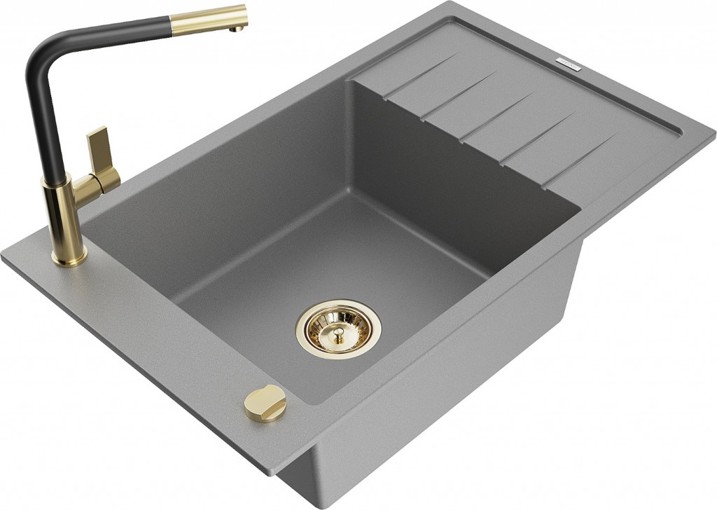 Technické údaje: Kuchyňský dřez: Rozměr: 795x480x200 mm Hloubka komory: 190 mm Rozměry komory: 465x420 mm Průměr odtoku: ø90 mm Typ: 1-miska s krátkým odkapávačem Typ: Zapuštěné do pracovní desky Barva: Šedá Povrchová úprava sifonu: zlatá Materiál: žula (80% žulové kamenivo 20% pryskyřice) Přepadový otvor: Ano Otvory: (baterie, automat) 2 Instalace: Univerzální, lze instalovat s odkapávačem na levou nebo pravou stranu Vysoká odolnost proti poškrábání a změně barvy Odolnost proti tepelným šokům Povrch pro snadné čištění Jeden dodatečný vyfrézovaný otvor pro samoděrování ø35 Kuchyňská baterie: Materiál: mosaz Barva: Zlatá/Černá Hlava: Keramická Perlátor: Ano Typ: Jednopákové Rozsah výtoku: 245 mm Výška baterie: 307 mm Ean: 5905315060143