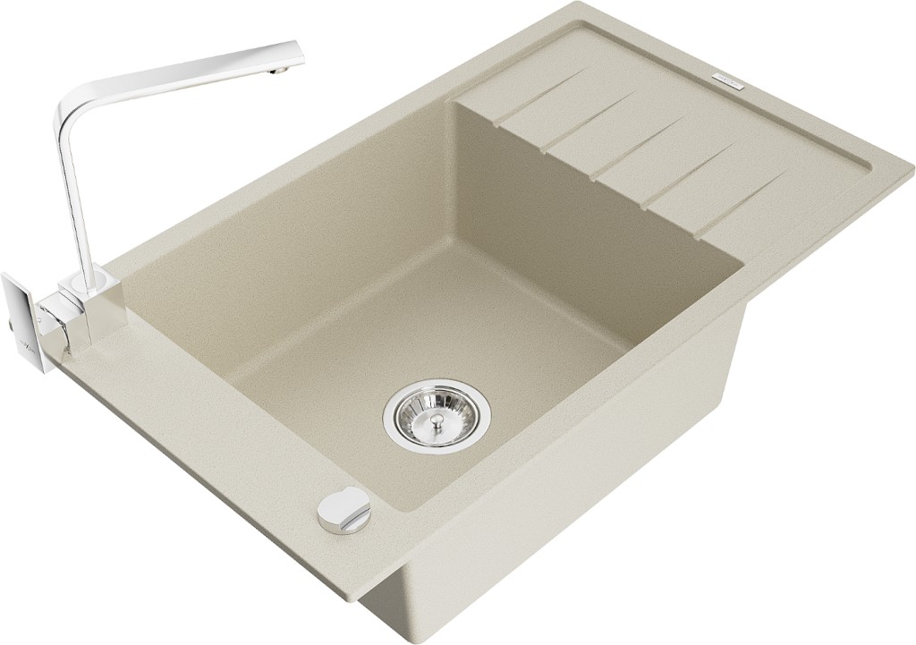 Technické dáta: drez: Rozmer: 795 x 480 x 200 mm Hĺbka komory: 190 mm Rozmery komory: 465x420 mm Priemer odtoku: ø90 mm Typ: 1-miska s krátkym odkvapkávačom Typ: Zapustené do pracovnej dosky Farba béžová Povrchová úprava sifónu: Chrome Materiál: žula (80% žulové kamenivo, 20% živice) Prepadový otvor: Áno Otvory: (batérie, automatické) 2 Inštalácia: Univerzálna, je možné inštalovať s odkvapkávačom na ľavú alebo pravú stranu Vysoká odolnosť proti poškriabaniu a zmene farby Odolnosť proti tepelným šokom Ľahko čistiteľný povrch Jeden dodatočný vyfrézovaný otvor na samodierovanie ø35 kuchynská batéria: Materiál: mosadz Farba: Chrome Hlava: Keramická Prevzdušňovač: Áno Typ: Jedna páka Výška batérie: 290 mm Rozsah výtoku: 220 mm(GT) Ean: 5905315019493