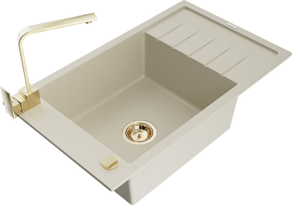 Technické dáta: drez: Rozmer: 795 x 480 x 200 mm Hĺbka komory: 190 mm Rozmery komory: 465x420 mm Priemer odtoku: ø90 mm Typ: 1-miska s krátkym odkvapkávačom Typ: Zapustené do pracovnej dosky Farba béžová Povrchová úprava sifónu: zlatá Materiál: žula (80% žulové kamenivo, 20% živice) Prepadový otvor: Áno Otvory: (batérie, automatické) 2 Inštalácia: Univerzálna, je možné inštalovať s odkvapkávačom na ľavú alebo pravú stranu Vysoká odolnosť proti poškriabaniu a zmene farby Odolnosť proti tepelným šokom Ľahko čistiteľný povrch Jeden dodatočný vyfrézovaný otvor na samodierovanie ø35 kuchynská batéria: Materiál: mosadz Farba: Zlatá Hlava: Keramická Prevzdušňovač: Áno Typ: Jedna páka Výška batérie: 290 mm Rozsah výtoku: 220 mm(GT) Ean: 5905315019516