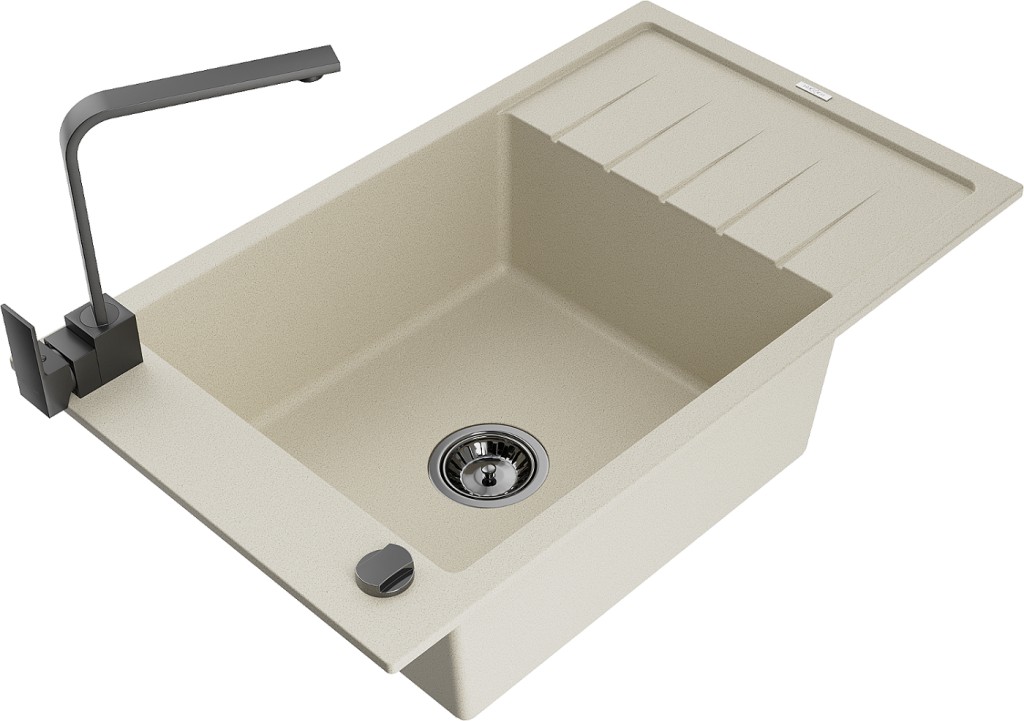 Technické dáta: drez: Rozmer: 795 x 480 x 200 mm Hĺbka komory: 190 mm Rozmery komory: 465x420 mm Priemer odtoku: ø90 mm Typ: 1-miska s krátkym odkvapkávačom Typ: Zapustené do pracovnej dosky Farba béžová Povrchová úprava sifónu: čierna Materiál: žula (80% žulové kamenivo, 20% živice) Prepadový otvor: Áno Otvory: (batérie, automatické) 2 Inštalácia: Univerzálna, je možné inštalovať s odkvapkávačom na ľavú alebo pravú stranu Vysoká odolnosť proti poškriabaniu a zmene farby Odolnosť proti tepelným šokom Ľahko čistiteľný povrch Jeden dodatočný vyfrézovaný otvor na samodierovanie ø35 kuchynská batéria: Materiál: mosadz Čierna farba Hlava: Keramická Prevzdušňovač: Áno Typ: Jedna páka Výška batérie: 290 mm Rozsah výtoku: 220 mm(GT) Ean: 5905315019523