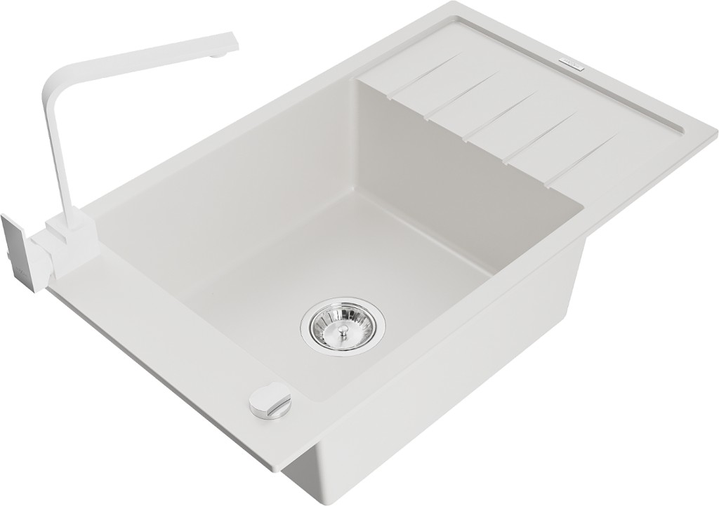 Technické dáta: drez: Rozmer: 795 x 480 x 200 mm Hĺbka komory: 190 mm Rozmery komory: 465x420 mm Priemer odtoku: ø90 mm Typ: 1-miska s krátkym odkvapkávačom Typ: Zapustené do pracovnej dosky biela farba Povrchová úprava sifónu: Chrome Materiál: žula (80% žulové kamenivo, 20% živice) Prepadový otvor: Áno Otvory: (batérie, automatické) 2 Inštalácia: Univerzálna, je možné inštalovať s odkvapkávačom na ľavú alebo pravú stranu Vysoká odolnosť proti poškriabaniu a zmene farby Odolnosť proti tepelným šokom Ľahko čistiteľný povrch Jeden dodatočný vyfrézovaný otvor na samodierovanie ø35 kuchynská batéria: Materiál: mosadz biela farba Hlava: Keramická Prevzdušňovač: Áno Typ: Jedna páka Výška batérie: 290 mm Rozsah výtoku: 220 mm(GT) Ean: 5905315019462