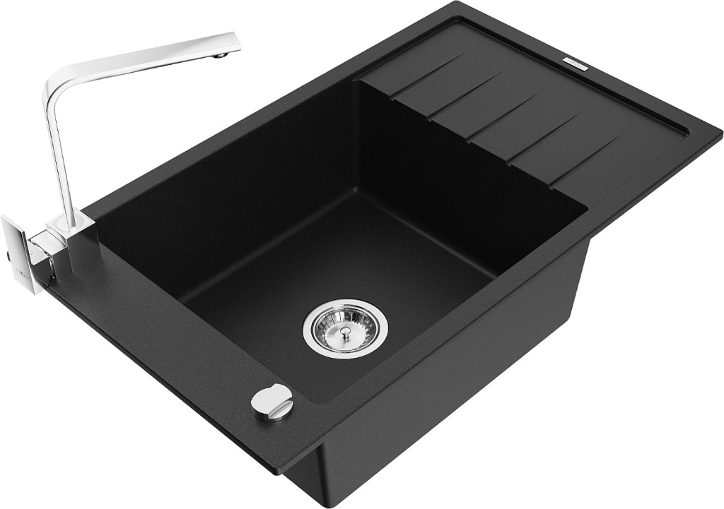 Technické dáta: drez: Rozmer: 795 x 480 x 200 mm Hĺbka komory: 190 mm Rozmery komory: 465x420 mm Priemer odtoku: ø90 mm Typ: 1-miska s krátkym odkvapkávačom Typ: Zapustené do pracovnej dosky Čierna farba Povrchová úprava sifónu: Chrome Materiál: žula (80% žulové kamenivo, 20% živice) Prepadový otvor: Áno Otvory: (batérie, automatické) 2 Inštalácia: Univerzálna, je možné inštalovať s odkvapkávačom na ľavú alebo pravú stranu Vysoká odolnosť proti poškriabaniu a zmene farby Odolnosť proti tepelným šokom Ľahko čistiteľný povrch Jeden dodatočný vyfrézovaný otvor na samodierovanie ø35 kuchynská batéria: Materiál: mosadz Farba: Chrome Hlava: Keramická Prevzdušňovač: Áno Typ: Jedna páka Výška batérie: 290 mm Rozsah výtoku: 220 mm(GT) Ean: 5905315019721