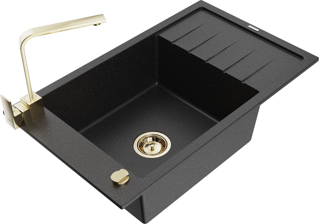 Technické dáta: drez: Rozmer: 795 x 480 x 200 mm Hĺbka komory: 190 mm Rozmery komory: 465x420 mm Priemer odtoku: ø90 mm Typ: 1-miska s krátkym odkvapkávačom Typ: Zapustené do pracovnej dosky Farba: čierna/strieborná metalíza Povrchová úprava sifónu: zlatá Materiál: žula (80% žulové kamenivo, 20% živice) Prepadový otvor: Áno Otvory: (batérie, automatické) 2 Inštalácia: Univerzálna, je možné inštalovať s odkvapkávačom na ľavú alebo pravú stranu Vysoká odolnosť proti poškriabaniu a zmene farby Odolnosť proti tepelným šokom Ľahko čistiteľný povrch Jeden dodatočný vyfrézovaný otvor na samodierovanie ø35 kuchynská batéria: Materiál: mosadz Farba: Zlatá Hlava: Keramická Prevzdušňovač: Áno Typ: Jedna páka Výška batérie: 290 mm Rozsah výtoku: 220 mm(GT) Ean: 5905315019592