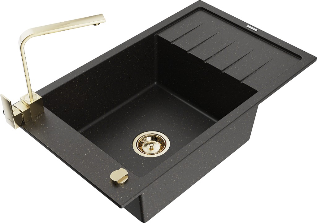 Technické dáta: drez: Rozmer: 795 x 480 x 200 mm Hĺbka komory: 190 mm Rozmery komory: 465x420 mm Priemer odtoku: ø90 mm Typ: 1-miska s krátkym odkvapkávačom Typ: Zapustené do pracovnej dosky Farba: čierna / zlatá metalíza Povrchová úprava sifónu: zlatá Materiál: žula (80% žulové kamenivo, 20% živice) Prepadový otvor: Áno Otvory: (batérie, automatické) 2 Inštalácia: Univerzálna, je možné inštalovať s odkvapkávačom na ľavú alebo pravú stranu Vysoká odolnosť proti poškriabaniu a zmene farby Odolnosť proti tepelným šokom Ľahko čistiteľný povrch Jeden dodatočný vyfrézovaný otvor na samodierovanie ø35 kuchynská batéria: Materiál: mosadz Farba: Zlatá Hlava: Keramická Prevzdušňovač: Áno Typ: Jedna páka Výška batérie: 290 mm Rozsah výtoku: 220 mm(GT) Ean: 5905315019639