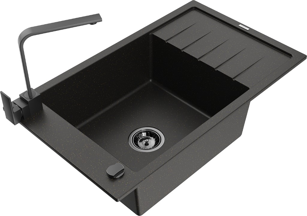 Technické dáta: drez: Rozmer: 795 x 480 x 200 mm Hĺbka komory: 190 mm Rozmery komory: 465x420 mm Priemer odtoku: ø90 mm Typ: 1-miska s krátkym odkvapkávačom Typ: Zapustené do pracovnej dosky Farba: čierna / zlatá metalíza Povrchová úprava sifónu: čierna Materiál: žula (80% žulové kamenivo, 20% živice) Prepadový otvor: Áno Otvory: (batérie, automatické) 2 Inštalácia: Univerzálna, je možné inštalovať s odkvapkávačom na ľavú alebo pravú stranu Vysoká odolnosť proti poškriabaniu a zmene farby Odolnosť proti tepelným šokom Ľahko čistiteľný povrch Jeden dodatočný vyfrézovaný otvor na samodierovanie ø35 kuchynská batéria: Materiál: mosadz Čierna farba Hlava: Keramická Prevzdušňovač: Áno Typ: Jedna páka Výška batérie: 290 mm Rozsah výtoku: 220 mm(GT) Ean: 5905315019653