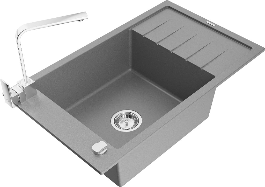 Technické dáta: drez: Rozmer: 795 x 480 x 200 mm Hĺbka komory: 190 mm Rozmery komory: 465x420 mm Priemer odtoku: ø90 mm Typ: 1-miska s krátkym odkvapkávačom Typ: Zapustené do pracovnej dosky Šedá farba Povrchová úprava sifónu: Chrome Materiál: žula (80% žulové kamenivo, 20% živice) Prepadový otvor: Áno Otvory: (batérie, automatické) 2 Inštalácia: Univerzálna, je možné inštalovať s odkvapkávačom na ľavú alebo pravú stranu Vysoká odolnosť proti poškriabaniu a zmene farby Odolnosť proti tepelným šokom Ľahko čistiteľný povrch Jeden dodatočný vyfrézovaný otvor na samodierovanie ø35 kuchynská batéria: Materiál: mosadz Farba: Chrome Hlava: Keramická Prevzdušňovač: Áno Typ: Jedna páka Výška batérie: 290 mm Rozsah výtoku: 220 mm(GT) Ean: 5905315019530
