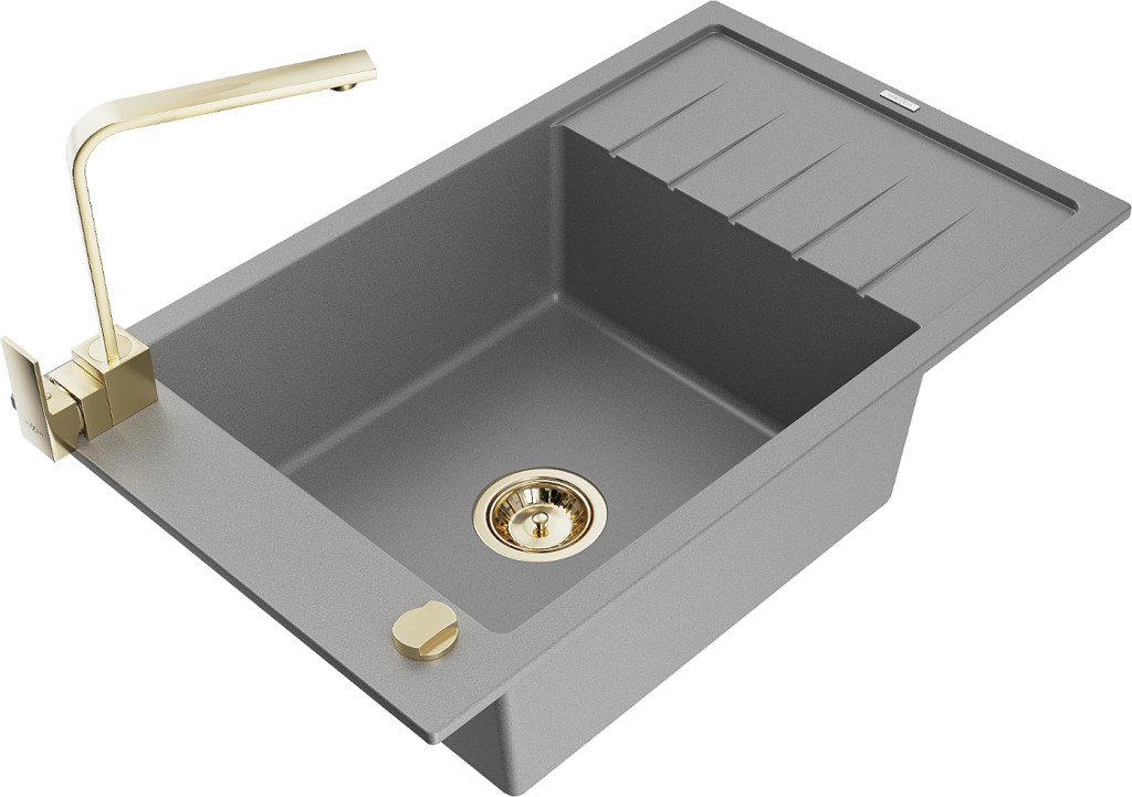 Technické dáta: drez: Rozmer: 795 x 480 x 200 mm Hĺbka komory: 190 mm Rozmery komory: 465x420 mm Priemer odtoku: ø90 mm Typ: 1-miska s krátkym odkvapkávačom Typ: Zapustené do pracovnej dosky Šedá farba Povrchová úprava sifónu: zlatá Materiál: žula (80% žulové kamenivo, 20% živice) Prepadový otvor: Áno Otvory: (batérie, automatické) 2 Inštalácia: Univerzálna, je možné inštalovať s odkvapkávačom na ľavú alebo pravú stranu Vysoká odolnosť proti poškriabaniu a zmene farby Odolnosť proti tepelným šokom Ľahko čistiteľný povrch Jeden dodatočný vyfrézovaný otvor na samodierovanie ø35 kuchynská batéria: Materiál: mosadz Farba: Zlatá Hlava: Keramická Prevzdušňovač: Áno Typ: Jedna páka Výška batérie: 290 mm Rozsah výtoku: 220 mm(GT) Ean: 5905315019547