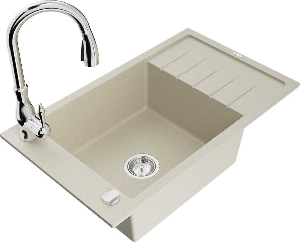 Technické dáta: drez: Rozmer: 795 x 480 x 200 mm Hĺbka komory: 190 mm Rozmery komory: 465x420 mm Priemer odtoku: ø90 mm Typ: 1-miska s krátkym odkvapkávačom Typ: Zapustené do pracovnej dosky Farba béžová Povrchová úprava sifónu: Chrome Materiál: žula (80% žulové kamenivo, 20% živice) Prepadový otvor: Áno Otvory: (batérie, automatické) 2 Inštalácia: Univerzálna, je možné inštalovať s odkvapkávačom na ľavú alebo pravú stranu Vysoká odolnosť proti poškriabaniu a zmene farby Odolnosť proti tepelným šokom Ľahko čistiteľný povrch Jeden dodatočný vyfrézovaný otvor na samodierovanie ø35 kuchynská batéria: Materiál: mosadz Farba: Chrome Hlava: Keramická Prevzdušňovač: Áno Typ: Jedna páka Výška batérie: 410 mm Rozsah výtoku: 231 mm(GT) Ean: 5905315034847