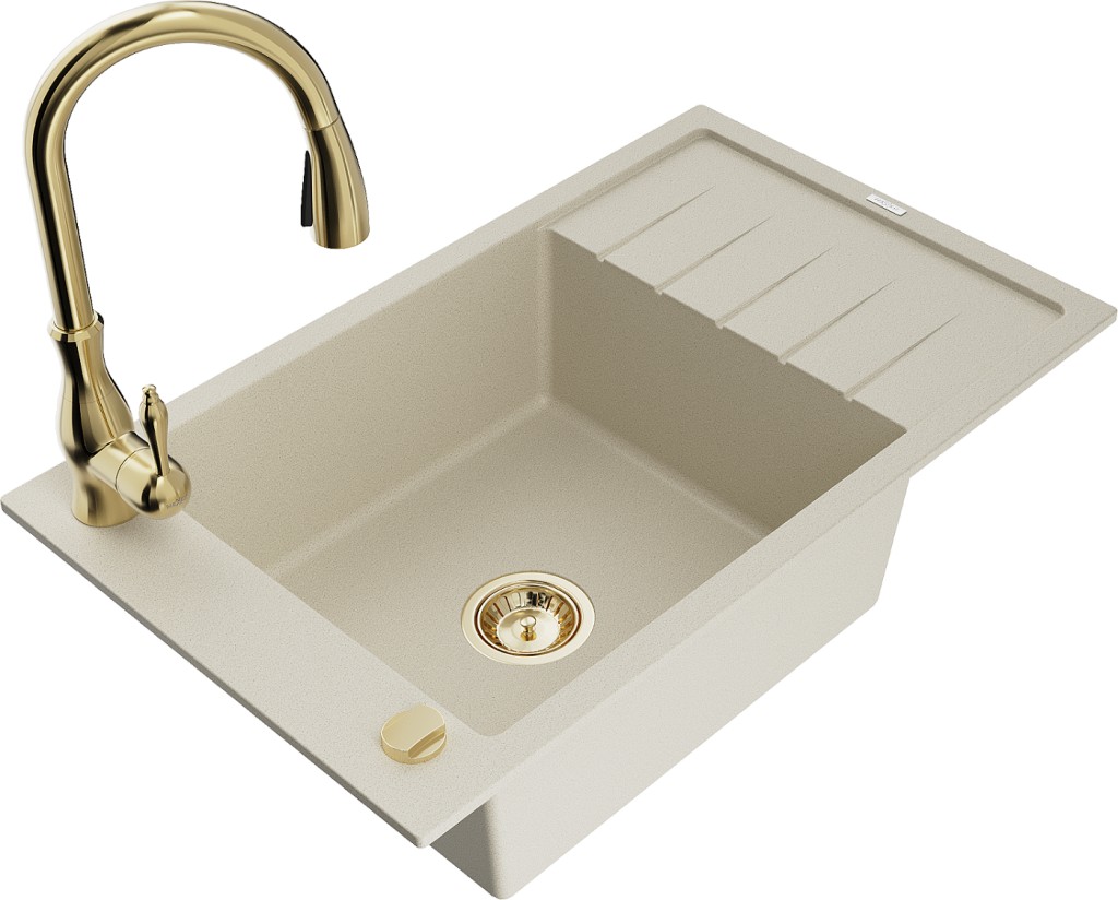 Technické dáta: drez: Rozmer: 795 x 480 x 200 mm Hĺbka komory: 190 mm Rozmery komory: 465x420 mm Priemer odtoku: ø90 mm Typ: 1-miska s krátkym odkvapkávačom Typ: Zapustené do pracovnej dosky Farba béžová Povrchová úprava sifónu: zlatá Materiál: žula (80% žulové kamenivo, 20% živice) Prepadový otvor: Áno Otvory: (batérie, automatické) 2 Inštalácia: Univerzálna, je možné inštalovať s odkvapkávačom na ľavú alebo pravú stranu Vysoká odolnosť proti poškriabaniu a zmene farby Odolnosť proti tepelným šokom Ľahko čistiteľný povrch Jeden dodatočný vyfrézovaný otvor na samodierovanie ø35 kuchynská batéria: Materiál: mosadz Farba: Zlatá Hlava: Keramická Prevzdušňovač: Áno Typ: Jedna páka Výška batérie: 410 mm Rozsah výtoku: 231 mm(GT) Ean: 5905315034861