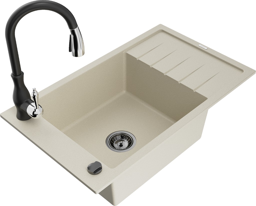 Technické dáta: drez: Rozmer: 795 x 480 x 200 mm Hĺbka komory: 190 mm Rozmery komory: 465x420 mm Priemer odtoku: ø90 mm Typ: 1-miska s krátkym odkvapkávačom Typ: Zapustené do pracovnej dosky Farba béžová Povrchová úprava sifónu: čierna Materiál: žula (80% žulové kamenivo, 20% živice) Prepadový otvor: Áno Otvory: (batérie, automatické) 2 Inštalácia: Univerzálna, je možné inštalovať s odkvapkávačom na ľavú alebo pravú stranu Vysoká odolnosť proti poškriabaniu a zmene farby Odolnosť proti tepelným šokom Ľahko čistiteľný povrch Jeden dodatočný vyfrézovaný otvor na samodierovanie ø35 kuchynská batéria: Materiál: mosadz Čierna farba Hlava: Keramická Prevzdušňovač: Áno Typ: Jedna páka Výška batérie: 410 mm Rozsah výtoku: 231 mm (GT) Ean: 5905315034878