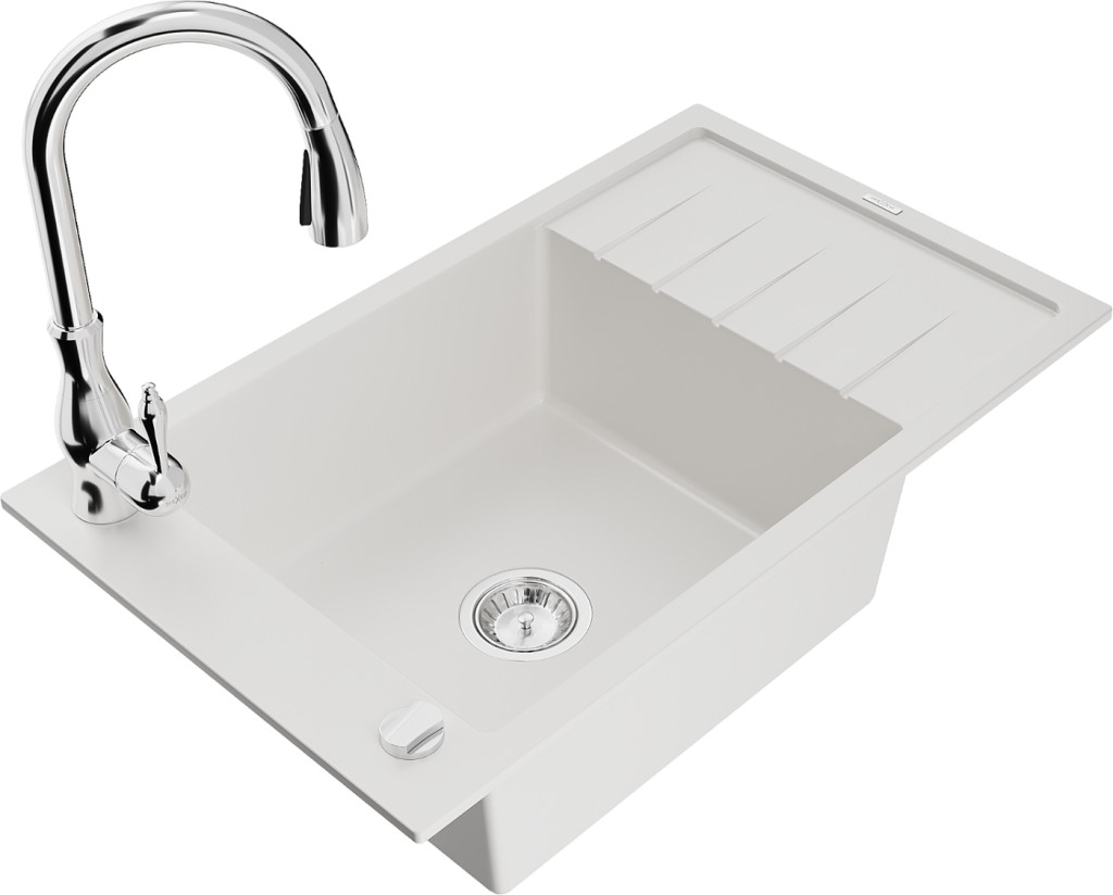 Technické dáta: drez: Rozmer: 795 x 480 x 200 mm Hĺbka komory: 190 mm Rozmery komory: 465x420 mm Priemer odtoku: ø90 mm Typ: 1-miska s krátkym odkvapkávačom Typ: Zapustené do pracovnej dosky biela farba Povrchová úprava sifónu: Chrome Materiál: žula (80% žulové kamenivo, 20% živice) Prepadový otvor: Áno Otvory: (batérie, automatické) 2 Inštalácia: Univerzálna, je možné inštalovať s odkvapkávačom na ľavú alebo pravú stranu Vysoká odolnosť proti poškriabaniu a zmene farby Odolnosť proti tepelným šokom Ľahko čistiteľný povrch Jeden dodatočný vyfrézovaný otvor na samodierovanie ø35 kuchynská batéria: Materiál: mosadz Farba: Chrome Hlava: Keramická Prevzdušňovač: Áno Typ: Jedna páka Výška batérie: 410 mm Rozsah výtoku: 231 mm(GT) Ean: 5905315034809