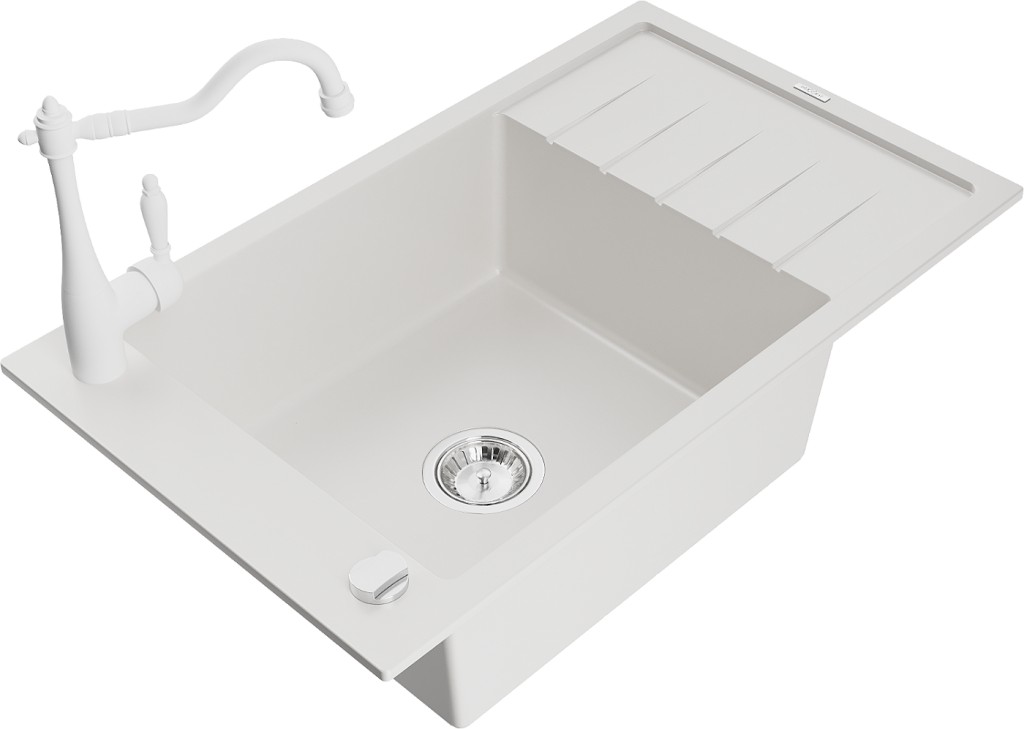 Technické dáta: drez: Rozmer: 795 x 480 x 200 mm Hĺbka komory: 190 mm Rozmery komory: 465x420 mm Priemer odtoku: ø90 mm Typ: 1-miska s krátkym odkvapkávačom Typ: Zapustené do pracovnej dosky biela farba Povrchová úprava sifónu: Chrome Materiál: žula (80% žulové kamenivo, 20% živice) Prepadový otvor: Áno Otvory: (batérie, automatické) 2 Inštalácia: Univerzálna, je možné inštalovať s odkvapkávačom na ľavú alebo pravú stranu Vysoká odolnosť proti poškriabaniu a zmene farby Odolnosť proti tepelným šokom Ľahko čistiteľný povrch Jeden dodatočný vyfrézovaný otvor na samodierovanie ø35 kuchynská batéria: Materiál: mosadz biela farba Hlava: Keramická Prevzdušňovač: Áno Typ: Jedna páka Výška batérie: 290 mm Rozsah výtoku: 260 mm(GT) Ean: 5905315039958
