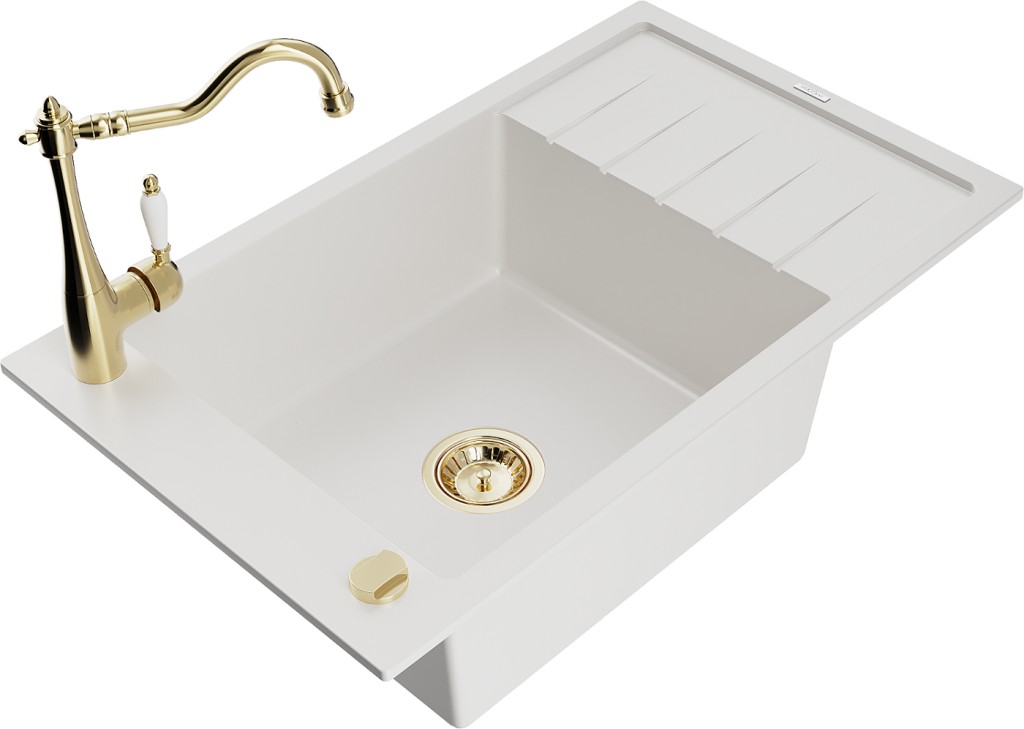 Technické dáta: drez: Rozmer: 795 x 480 x 200 mm Hĺbka komory: 190 mm Rozmery komory: 465x420 mm Priemer odtoku: ø90 mm Typ: 1-miska s krátkym odkvapkávačom Typ: Zapustené do pracovnej dosky biela farba Povrchová úprava sifónu: zlatá Materiál: žula (80% žulové kamenivo, 20% živice) Prepadový otvor: Áno Otvory: (batérie, automatické) 2 Inštalácia: Univerzálna, je možné inštalovať s odkvapkávačom na ľavú alebo pravú stranu Vysoká odolnosť proti poškriabaniu a zmene farby Odolnosť proti tepelným šokom Ľahko čistiteľný povrch Jeden dodatočný vyfrézovaný otvor na samodierovanie ø35 kuchynská batéria: Materiál: mosadz Farba: Zlatá Hlava: Keramická Prevzdušňovač: Áno Typ: Jedna páka Výška batérie: 290 mm Rozsah výtoku: 260 mm(GT) Ean: 5905315039965