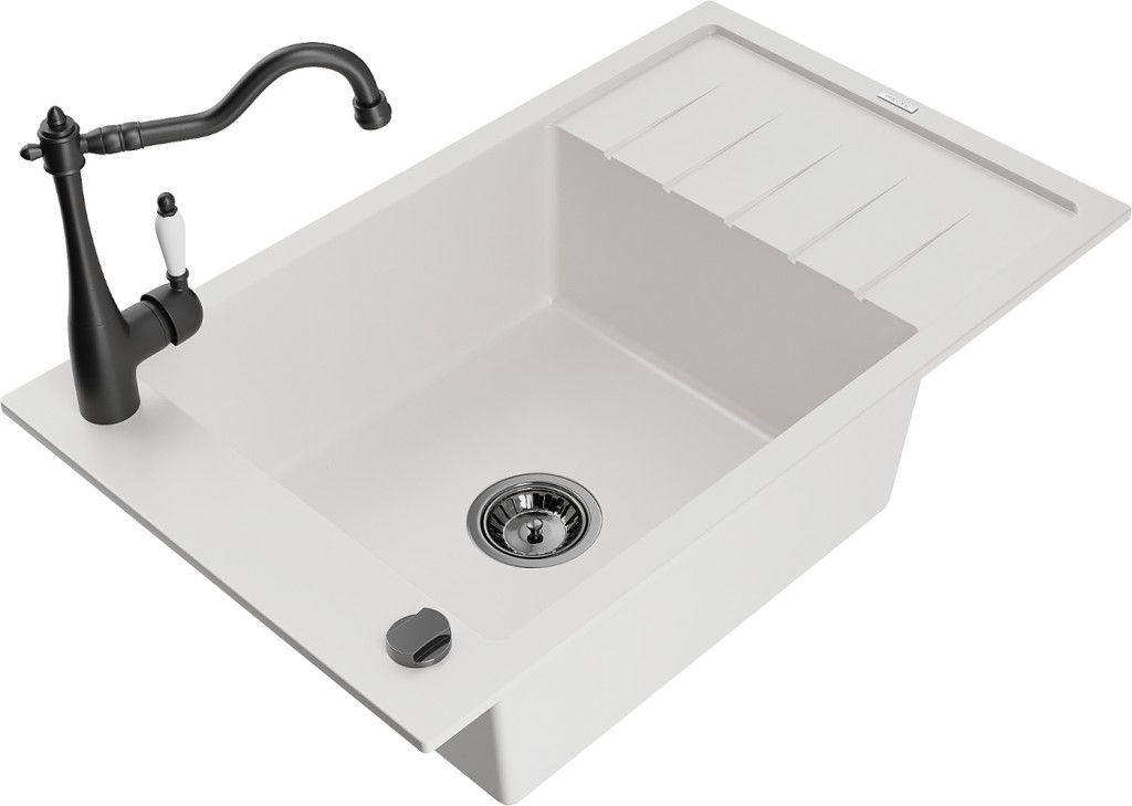 Technické dáta: drez: Rozmer: 795 x 480 x 200 mm Hĺbka komory: 190 mm Rozmery komory: 465x420 mm Priemer odtoku: ø90 mm Typ: 1-miska s krátkym odkvapkávačom Typ: Zapustené do pracovnej dosky biela farba Povrchová úprava sifónu: čierna Materiál: žula (80% žulové kamenivo, 20% živice) Prepadový otvor: Áno Otvory: (batérie, automatické) 2 Inštalácia: Univerzálna, je možné inštalovať s odkvapkávačom na ľavú alebo pravú stranu Vysoká odolnosť proti poškriabaniu a zmene farby Odolnosť proti tepelným šokom Ľahko čistiteľný povrch Jeden dodatočný vyfrézovaný otvor na samodierovanie ø35 kuchynská batéria: Materiál: mosadz Čierna farba Hlava: Keramická Prevzdušňovač: Áno Typ: Jedna páka Výška batérie: 290 mm Rozsah výtoku: 260 mm(GT) Ean: 5905315039972