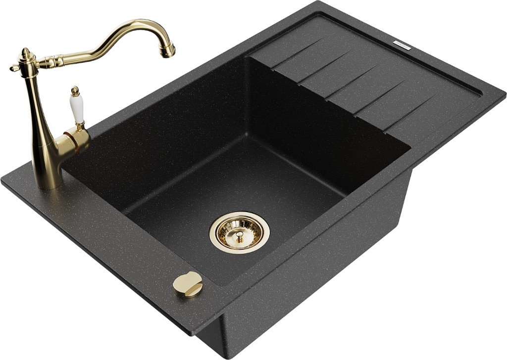 Technické dáta: drez: Rozmer: 795 x 480 x 200 mm Hĺbka komory: 190 mm Rozmery komory: 465x420 mm Priemer odtoku: ø90 mm Typ: 1-miska s krátkym odkvapkávačom Typ: Zapustené do pracovnej dosky Farba: čierna/strieborná metalíza Povrchová úprava sifónu: zlatá Materiál: žula (80% žulové kamenivo, 20% živice) Prepadový otvor: Áno Otvory: (batérie, automatické) 2 Inštalácia: Univerzálna, je možné inštalovať s odkvapkávačom na ľavú alebo pravú stranu Vysoká odolnosť proti poškriabaniu a zmene farby Odolnosť proti tepelným šokom Ľahko čistiteľný povrch Jeden dodatočný vyfrézovaný otvor na samodierovanie ø35 kuchynská batéria: Materiál: mosadz Farba: Zlatá Hlava: Keramická Prevzdušňovač: Áno Typ: Jedna páka Výška batérie: 290 mm Rozsah výtoku: 260 mm(GT) Ean: 5905315040084