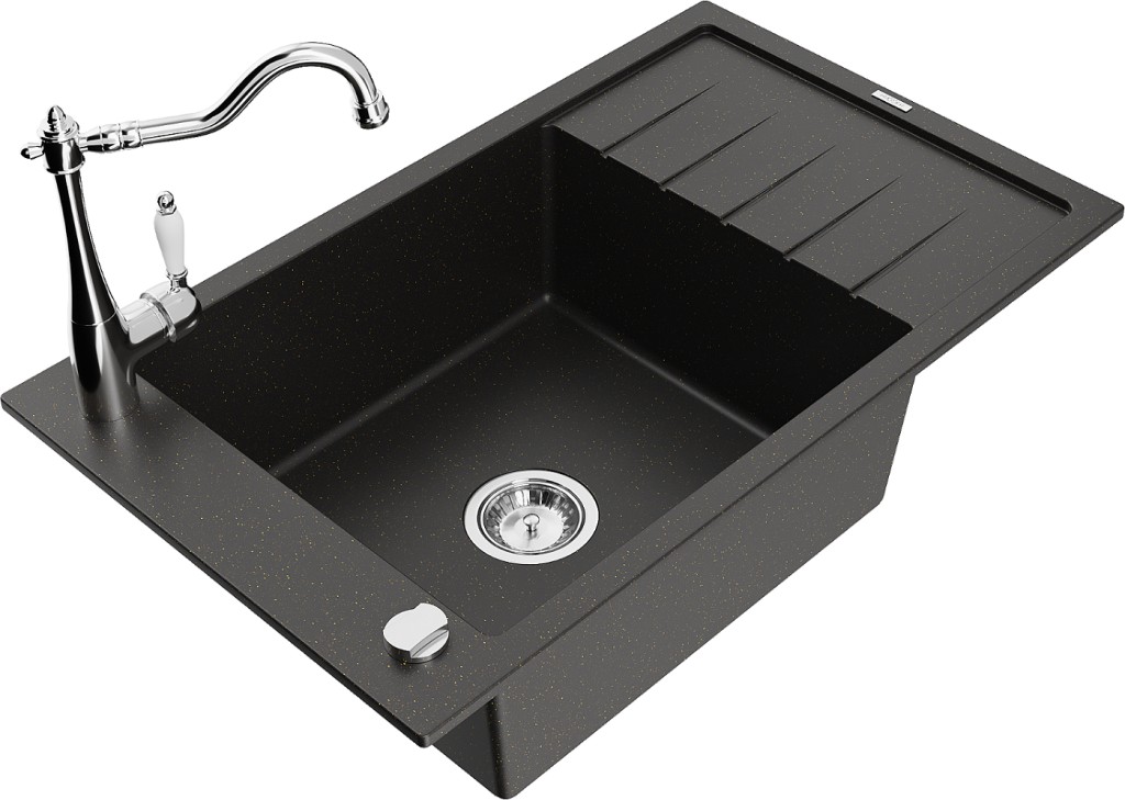 Technické dáta: drez: Rozmer: 795 x 480 x 200 mm Hĺbka komory: 190 mm Rozmery komory: 465x420 mm Priemer odtoku: ø90 mm Typ: 1-miska s krátkym odkvapkávačom Typ: Zapustené do pracovnej dosky Farba: čierna / zlatá metalíza Povrchová úprava sifónu: Chrome Materiál: žula (80% žulové kamenivo, 20% živice) Prepadový otvor: Áno Otvory: (batérie, automatické) 2 Inštalácia: Univerzálna, je možné inštalovať s odkvapkávačom na ľavú alebo pravú stranu Vysoká odolnosť proti poškriabaniu a zmene farby Odolnosť proti tepelným šokom Ľahko čistiteľný povrch Jeden dodatočný vyfrézovaný otvor na samodierovanie ø35 kuchynská batéria: Materiál: mosadz Farba: Chrome Hlava: Keramická Prevzdušňovač: Áno Typ: Jedna páka Výška batérie: 290 mm Rozsah výtoku: 260 mm(GT) Ean: 5905315040114