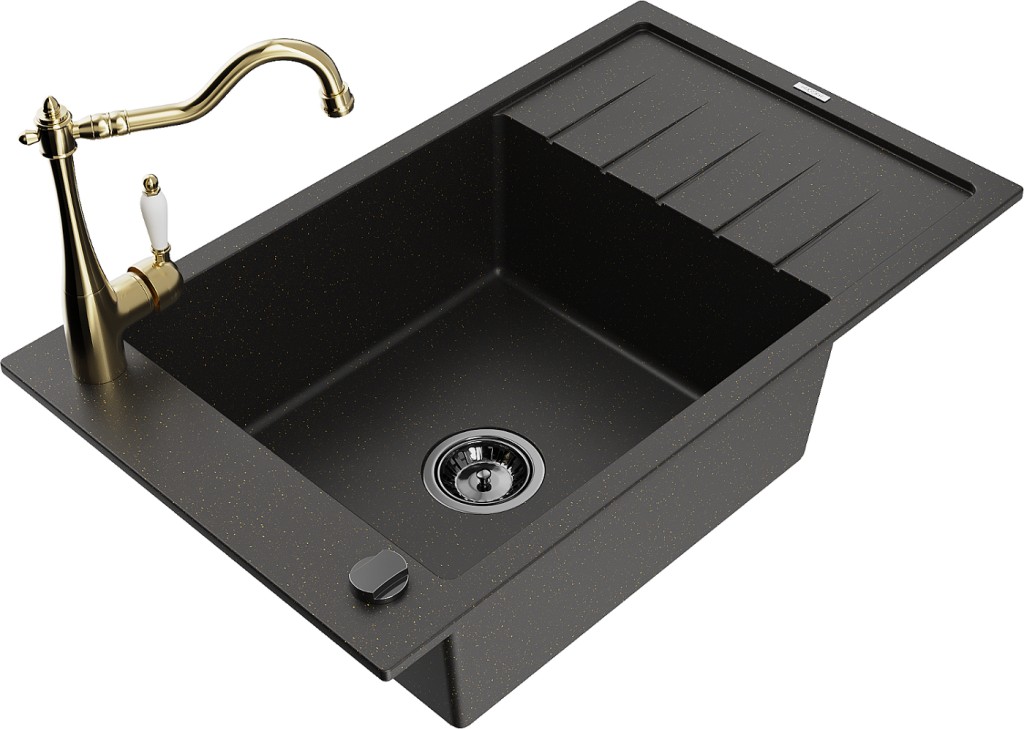 Technické dáta: drez: Rozmer: 795 x 480 x 200 mm Hĺbka komory: 190 mm Rozmery komory: 465x420 mm Priemer odtoku: ø90 mm Typ: 1-miska s krátkym odkvapkávačom Typ: Zapustené do pracovnej dosky Farba: čierna / zlatá metalíza Povrchová úprava sifónu: čierna Materiál: žula (80% žulové kamenivo, 20% živice) Prepadový otvor: Áno Otvory: (batérie, automatické) 2 Inštalácia: Univerzálna, je možné inštalovať s odkvapkávačom na ľavú alebo pravú stranu Vysoká odolnosť proti poškriabaniu a zmene farby Odolnosť proti tepelným šokom Ľahko čistiteľný povrch Jeden dodatočný vyfrézovaný otvor na samodierovanie ø35 kuchynská batéria: Materiál: mosadz Farba: Zlatá Hlava: Keramická Prevzdušňovač: Áno Typ: Jedna páka Výška batérie: 290 mm Rozsah výtoku: 260 mm(GT) Ean: 5905315040138