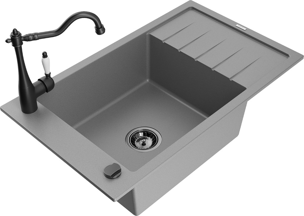 Technické dáta: drez: Rozmer: 795 x 480 x 200 mm Hĺbka komory: 190 mm Rozmery komory: 465x420 mm Priemer odtoku: ø90 mm Typ: 1-miska s krátkym odkvapkávačom Typ: Zapustené do pracovnej dosky Šedá farba Povrchová úprava sifónu: čierna Materiál: žula (80% žulové kamenivo, 20% živice) Prepadový otvor: Áno Otvory: (batérie, automatické) 2 Inštalácia: Univerzálna, je možné inštalovať s odkvapkávačom na ľavú alebo pravú stranu Vysoká odolnosť proti poškriabaniu a zmene farby Odolnosť proti tepelným šokom Ľahko čistiteľný povrch Jeden dodatočný vyfrézovaný otvor na samodierovanie ø35 kuchynská batéria: Materiál: mosadz Čierna farba Hlava: Keramická Prevzdušňovač: Áno Typ: Jedna páka Výška batérie: 290 mm Rozsah výtoku: 260 mm(GT) Ean: 5905315040053