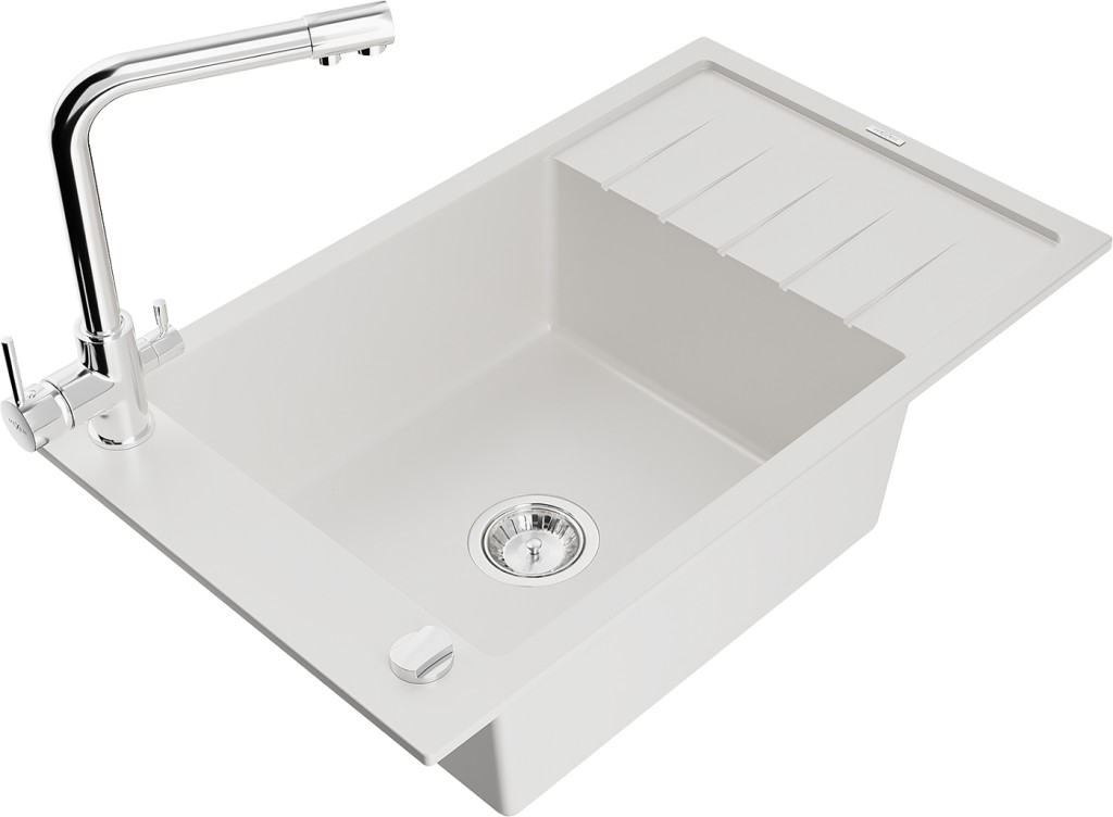 Technické dáta: drez: Rozmer: 795 x 480 x 200 mm Hĺbka komory: 190 mm Rozmery komory: 465x420 mm Priemer odtoku: ø90 mm Typ: 1-miska s krátkym odkvapkávačom Typ: Zapustené do pracovnej dosky biela farba Povrchová úprava sifónu: Chrome Materiál: žula (80% žulové kamenivo, 20% živice) Prepadový otvor: Áno Otvory: (batérie, automatické) 2 Inštalácia: Univerzálna, je možné inštalovať s odkvapkávačom na ľavú alebo pravú stranu Vysoká odolnosť proti poškriabaniu a zmene farby Odolnosť proti tepelným šokom Ľahko čistiteľný povrch Jeden dodatočný vyfrézovaný otvor na samodierovanie ø35 kuchynská batéria: Materiál: mosadz Farba: Chrome Hlava: Keramická Prevzdušňovač: Áno Typ: Dve rukoväte Rozsah výtoku: 235 mm Výška batérie: 315 mm Dvojhlavá batéria s prídavným kanálom pre filtrovanú pitnú vodu(GT) Ean: 5905315024572