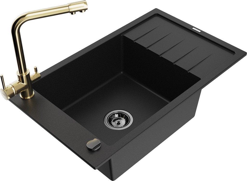 Technické dáta: drez: Rozmer: 795 x 480 x 200 mm Hĺbka komory: 190 mm Rozmery komory: 465x420 mm Priemer odtoku: ø90 mm Typ: 1-miska s krátkym odkvapkávačom Typ: Zapustené do pracovnej dosky Čierna farba Povrchová úprava sifónu: čierna Materiál: žula (80% žulové kamenivo, 20% živice) Prepadový otvor: Áno Otvory: (batérie, automatické) 2 Inštalácia: Univerzálna, je možné inštalovať s odkvapkávačom na ľavú alebo pravú stranu Vysoká odolnosť proti poškriabaniu a zmene farby Odolnosť proti tepelným šokom Ľahko čistiteľný povrch Jeden dodatočný vyfrézovaný otvor na samodierovanie ø35 kuchynská batéria: Materiál: mosadz Farba: Zlatá Hlava: Keramická Prevzdušňovač: Áno Typ: Dve rukoväte Rozsah výtoku: 235 mm Výška batérie: 315 mm Dvojhlavá batéria s prídavným kanálom pre filtrovanú pitnú vodu(GT) Ean: 5905315024862