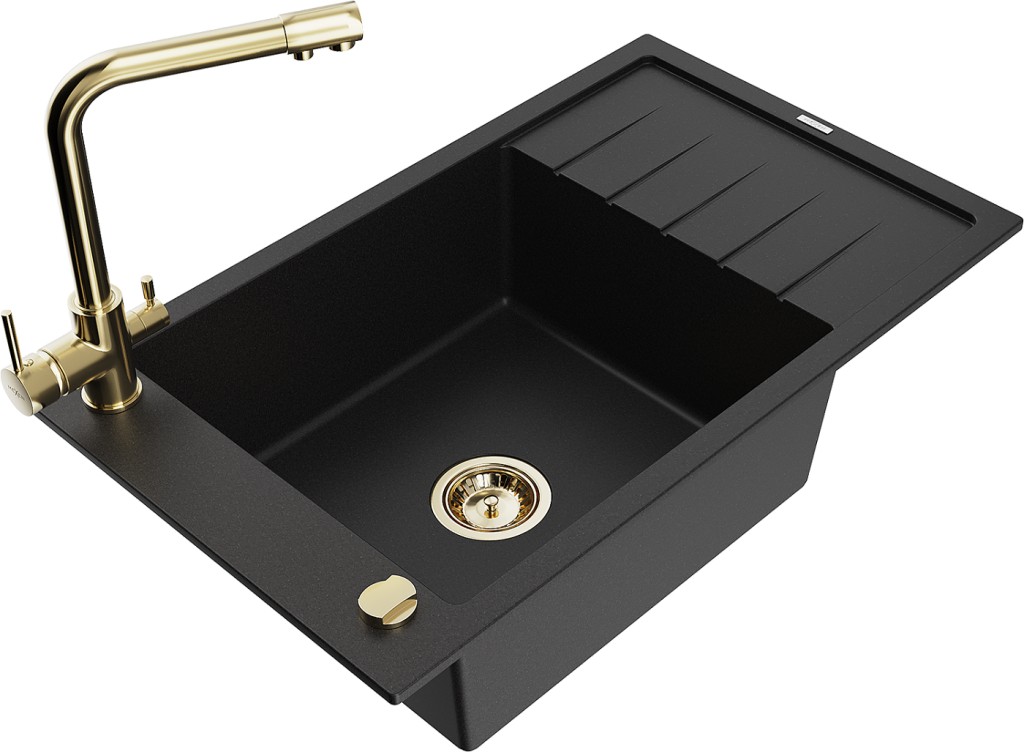 Technické dáta: drez: Rozmer: 795 x 480 x 200 mm Hĺbka komory: 190 mm Rozmery komory: 465x420 mm Priemer odtoku: ø90 mm Typ: 1-miska s krátkym odkvapkávačom Typ: Zapustené do pracovnej dosky Čierna farba Povrchová úprava sifónu: zlatá Materiál: žula (80% žulové kamenivo, 20% živice) Prepadový otvor: Áno Otvory: (batérie, automatické) 2 Inštalácia: Univerzálna, je možné inštalovať s odkvapkávačom na ľavú alebo pravú stranu Vysoká odolnosť proti poškriabaniu a zmene farby Odolnosť proti tepelným šokom Ľahko čistiteľný povrch Jeden dodatočný vyfrézovaný otvor na samodierovanie ø35 kuchynská batéria: Materiál: mosadz Farba: Zlatá Hlava: Keramická Prevzdušňovač: Áno Typ: Dve rukoväte Rozsah výtoku: 235 mm Výška batérie: 315 mm Dvojhlavá batéria s prídavným kanálom pre filtrovanú pitnú vodu(GT) Ean: 5905315024855