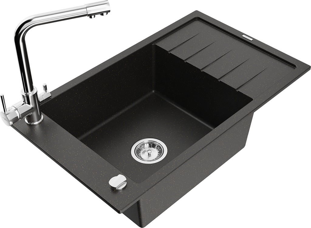 Technické dáta: drez: Rozmer: 795 x 480 x 200 mm Hĺbka komory: 190 mm Rozmery komory: 465x420 mm Priemer odtoku: ø90 mm Typ: 1-miska s krátkym odkvapkávačom Typ: Zapustené do pracovnej dosky Farba: čierna / zlatá metalíza Povrchová úprava sifónu: Chrome Materiál: žula (80% žulové kamenivo, 20% živice) Prepadový otvor: Áno Otvory: (batérie, automatické) 2 Inštalácia: Univerzálna, je možné inštalovať s odkvapkávačom na ľavú alebo pravú stranu Vysoká odolnosť proti poškriabaniu a zmene farby Odolnosť proti tepelným šokom Ľahko čistiteľný povrch Jeden dodatočný vyfrézovaný otvor na samodierovanie ø35 kuchynská batéria: Materiál: mosadz Farba: Chrome Hlava: Keramická Prevzdušňovač: Áno Typ: Dve rukoväte Rozsah výtoku: 235 mm Výška batérie: 315 mm Dvojhlavá batéria s prídavným kanálom pre filtrovanú pitnú vodu(GT) Ean: 5905315024749