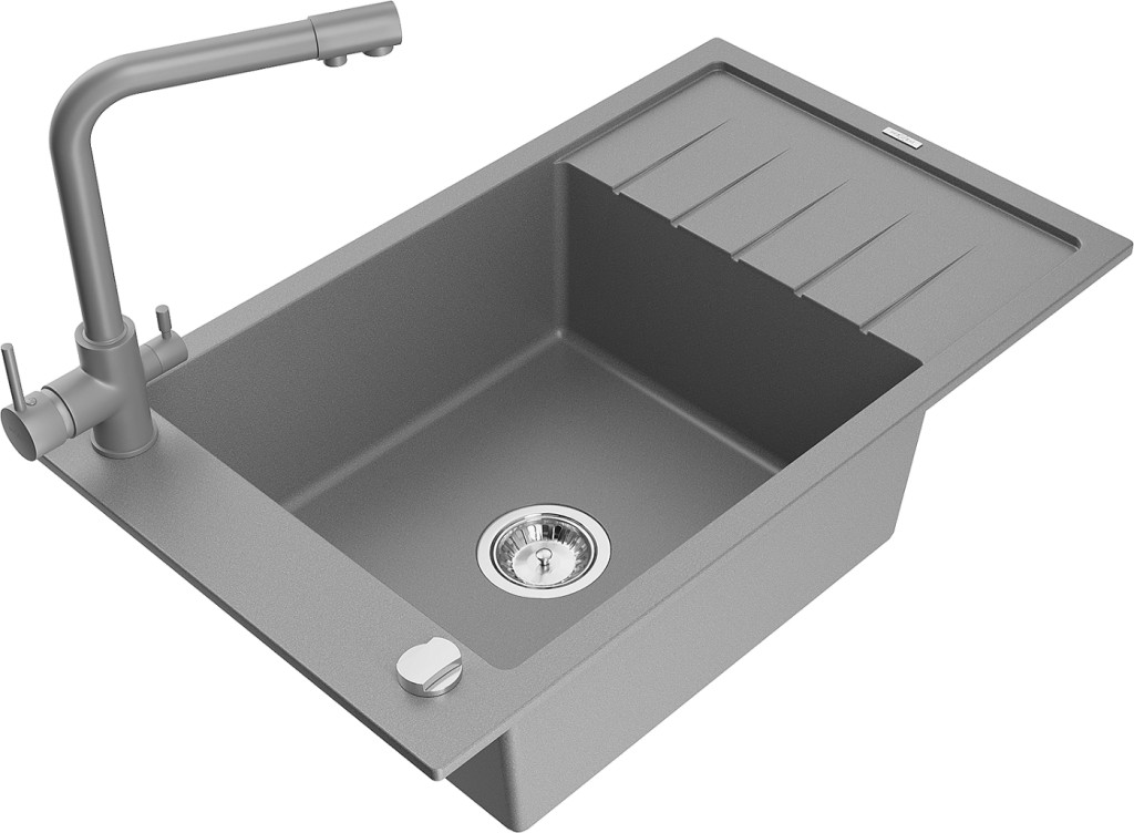 Technické dáta: drez: Rozmer: 795 x 480 x 200 mm Hĺbka komory: 190 mm Rozmery komory: 465x420 mm Priemer odtoku: ø90 mm Typ: 1-miska s krátkym odkvapkávačom Typ: Zapustené do pracovnej dosky Šedá farba Povrchová úprava sifónu: Chrome Materiál: žula (80% žulové kamenivo, 20% živice) Prepadový otvor: Áno Otvory: (batérie, automatické) 2 Inštalácia: Univerzálna, je možné inštalovať s odkvapkávačom na ľavú alebo pravú stranu Vysoká odolnosť proti poškriabaniu a zmene farby Odolnosť proti tepelným šokom Ľahko čistiteľný povrch Jeden dodatočný vyfrézovaný otvor na samodierovanie ø35 kuchynská batéria: Materiál: mosadz Šedá farba Hlava: Keramická Prevzdušňovač: Áno Typ: Dve rukoväte Rozsah výtoku: 235 mm Výška batérie: 315 mm Dvojhlavá batéria s prídavným kanálom pre filtrovanú pitnú vodu(GT) Ean: 5905315024695