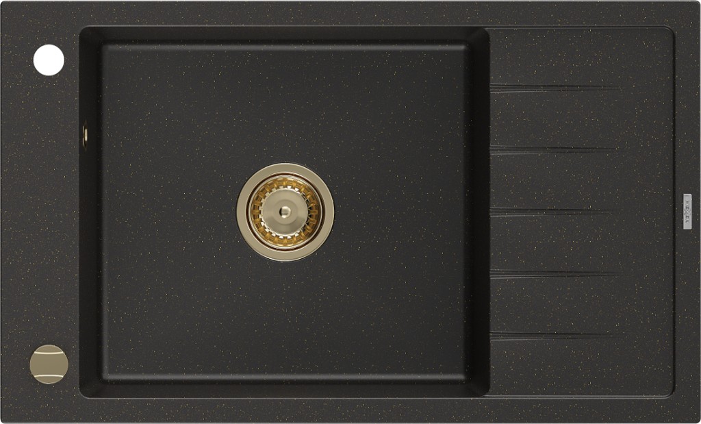 Technické dáta: Rozmer: 795 x 480 x 200 mm Hĺbka komory: 190 mm Rozmery komory: 465x420 mm Priemer odtoku: ø90 mm Typ: 1-miska s krátkym odkvapkávačom Typ: Zapustené do pracovnej dosky Materiál: žula Farba: čierna / zlatá metalíza Povrchová úprava sifónu: zlatá Prepadový otvor: Áno Otvor pre batériu: Áno Vrátane automatického sifónu Vysoká odolnosť proti poškriabaniu a zmene farby Odolnosť proti tepelným šokom Ľahko čistiteľný povrch Jeden dodatočný vyfrézovaný otvor na samodierovanie ø35 (GT) Ean: 5905315012012