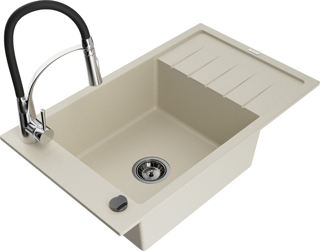 Technické dáta: drez: Rozmer: 795 x 480 x 200 mm Hĺbka komory: 190 mm Rozmery komory: 465x420 mm Priemer odtoku: ø90 mm Typ: 1-miska s krátkym odkvapkávačom Typ: Zapustené do pracovnej dosky Farba béžová Povrchová úprava sifónu: čierna Materiál: žula (80% žulové kamenivo, 20% živice) Prepadový otvor: Áno Otvory: (batérie, automatické) 2 Inštalácia: Univerzálna, je možné inštalovať s odkvapkávačom na ľavú alebo pravú stranu Vysoká odolnosť proti poškriabaniu a zmene farby Odolnosť proti tepelným šokom Ľahko čistiteľný povrch Jeden dodatočný vyfrézovaný otvor na samodierovanie ø35 kuchynská batéria: Materiál: mosadz Farba chróm/čierna Hlava: Keramická Prevzdušňovač: Áno Typ: Jedna páka Výška batérie: 430 mm Rozsah výtoku: 185 mm Batéria má výsuvný výtok(GT) Ean: 5905315045959
