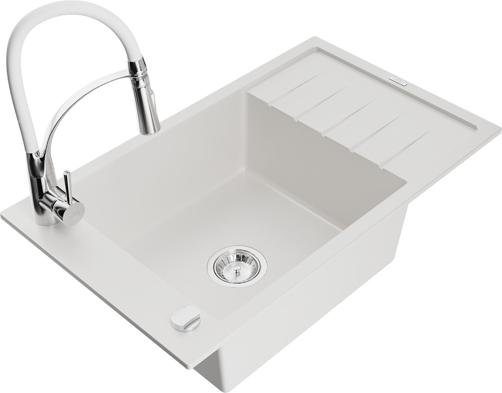 Technické dáta: drez: Rozmer: 795 x 480 x 200 mm Hĺbka komory: 190 mm Rozmery komory: 465x420 mm Priemer odtoku: ø90 mm Typ: 1-miska s krátkym odkvapkávačom Typ: Zapustené do pracovnej dosky biela farba Povrchová úprava sifónu: Chrome Materiál: žula (80% žulové kamenivo, 20% živice) Prepadový otvor: Áno Otvory: (batérie, automatické) 2 Inštalácia: Univerzálna, je možné inštalovať s odkvapkávačom na ľavú alebo pravú stranu Vysoká odolnosť proti poškriabaniu a zmene farby Odolnosť proti tepelným šokom Ľahko čistiteľný povrch Jeden dodatočný vyfrézovaný otvor na samodierovanie ø35 kuchynská batéria: Materiál: mosadz Farba: chróm/biela Hlava: Keramická Prevzdušňovač: Áno Typ: Jedna páka Výška batérie: 430 mm Rozsah výtoku: 185 mm Batéria má výsuvný výtok(GT) Ean: 5905315045874