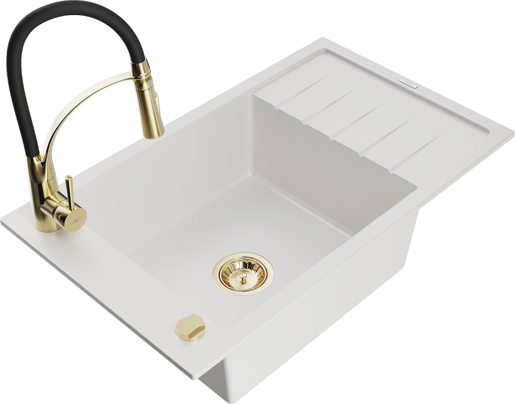 Technické dáta: drez: Rozmer: 795 x 480 x 200 mm Hĺbka komory: 190 mm Rozmery komory: 465x420 mm Priemer odtoku: ø90 mm Typ: 1-miska s krátkym odkvapkávačom Typ: Zapustené do pracovnej dosky biela farba Povrchová úprava sifónu: zlatá Materiál: žula (80% žulové kamenivo, 20% živice) Prepadový otvor: Áno Otvory: (batérie, automatické) 2 Inštalácia: Univerzálna, je možné inštalovať s odkvapkávačom na ľavú alebo pravú stranu Vysoká odolnosť proti poškriabaniu a zmene farby Odolnosť proti tepelným šokom Ľahko čistiteľný povrch Jeden dodatočný vyfrézovaný otvor na samodierovanie ø35 kuchynská batéria: Materiál: mosadz Farba: Zlatá/Čierna Hlava: Keramická Prevzdušňovač: Áno Typ: Jedna páka Výška batérie: 430 mm Rozsah výtoku: 185 mm Batéria má výsuvný výtok(GT) Ean: 5905315045904