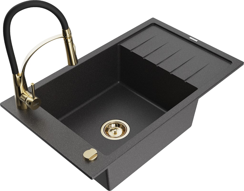 Technické dáta: drez: Rozmer: 795 x 480 x 200 mm Hĺbka komory: 190 mm Rozmery komory: 465x420 mm Priemer odtoku: ø90 mm Typ: 1-miska s krátkym odkvapkávačom Typ: Zapustené do pracovnej dosky Farba: Škvrnitá čierna Povrchová úprava sifónu: zlatá Materiál: žula (80% žulové kamenivo, 20% živice) Prepadový otvor: Áno Otvory: (batérie, automatické) 2 Inštalácia: Univerzálna, je možné inštalovať s odkvapkávačom na ľavú alebo pravú stranu Vysoká odolnosť proti poškriabaniu a zmene farby Odolnosť proti tepelným šokom Ľahko čistiteľný povrch Jeden dodatočný vyfrézovaný otvor na samodierovanie ø35 kuchynská batéria: Materiál: mosadz Farba: Zlatá/Čierna Hlava: Keramická Prevzdušňovač: Áno Typ: Jedna páka Výška batérie: 430 mm Rozsah výtoku: 185 mm Batéria má výsuvný výtok(GT) Ean: 5905315046208